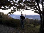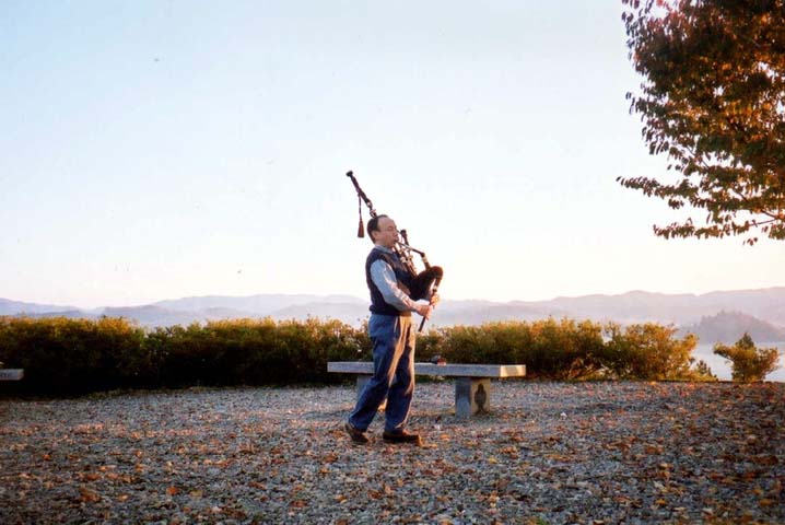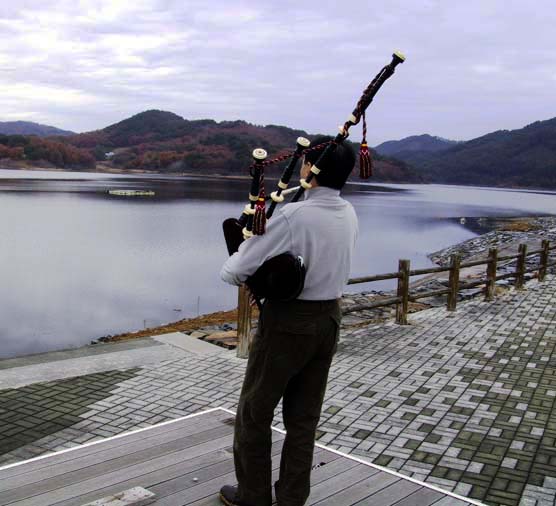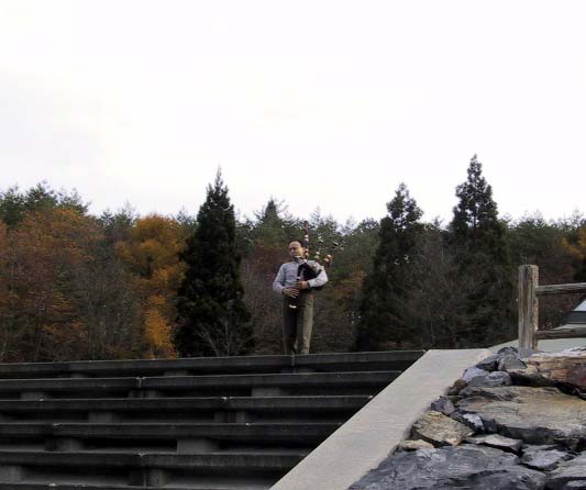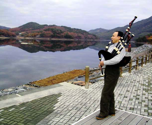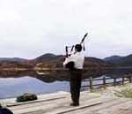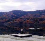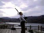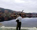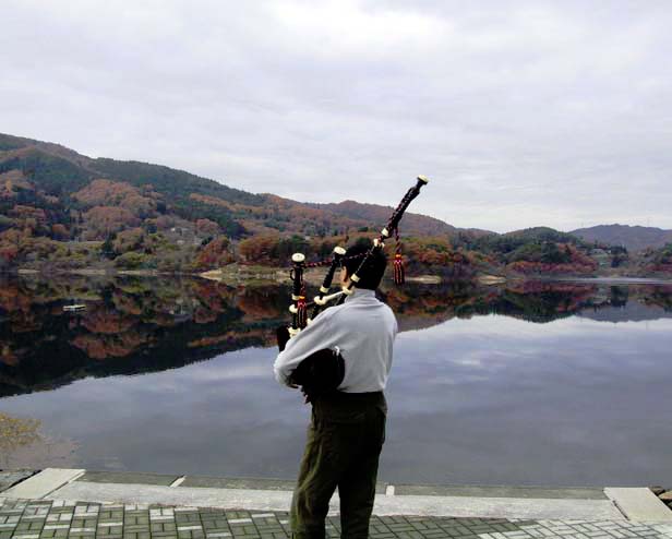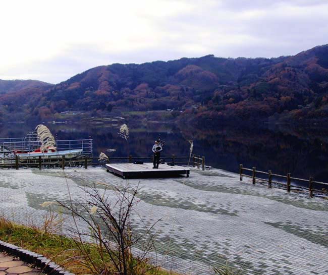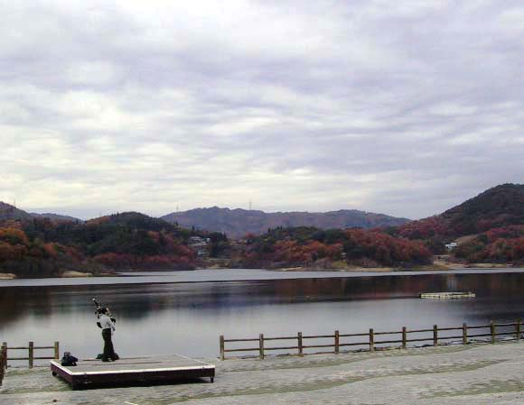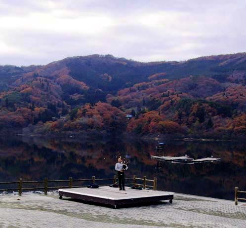 田瀬湖畔にて、湖面に映える見事な紅葉をバックに…