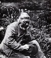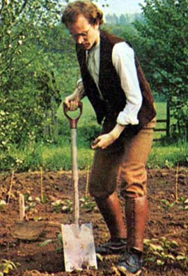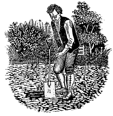 そんなふうにして手に入れた自作の wood-engraving 用の彫刻刀を手にして、さて、今度は版木の入手です。当然ですが木口木版画をする人がいないのですから、こればかりは、さすがの世界堂にも売っていません。仕方なく今回も、庭に生えていた桜の木を丸太切りして以前にやった方法と同じやり方でつるつるの版木を作りました。 練習のため、私が最初に作ったのは、ネコ好きのパートナーのために例のオーピーさんの本の表紙にあった「ネコがドアノブに手を掛けている」版画のコピー。そして、次には自分の署名用スタンプとして「ネコがバグパイプを演奏している」版画(!)のコピーでした。 やはり、それなりの彫刻刀を使うとオリジナルと同じような微細な表現が可能になり、かなり満足できる程度にまで到達することができました。 さて、版画をそのままコピーすることは一応できるようになったので、いよいよビクトリア時代にごく当たり前にやられていたように写真から版画を起こすということにトライすることにしました。 そこで、題材として私が選んだのがアルビオン・カントリーバンドの“The Battle of th Field”の裏ジャケットに掲載されていたアシュレイ・ハッチングスが畑で土を耕している写真です。 さて、肝心の写真は縦6cmあります。ということは少なくとも6cmの直径の桜の木の木口をすりすりして版木を作る必要があるということ。まあ、これが一大事でしたが、なんとかやり遂げました。 それから、写真をトレースしてそれを反転して版木にのり付けして、彫るというのは普通の版画と同じです。今だったら、トレースしたものを如何様にも拡大 縮小してトレーシングペーパーにコピーするのも簡単でしょうが、当時はそんな器用なことができなかったので、写真が6cmならそのとおりトレースして彫る しかなかったのです。 出来上がった版画はトマス・ビュウィックの版画とは比べ物にならない位稚拙なものではありますが、一枚の写真から掘り起した初めての木版画ですから、自分としてはまあまあ満足のいく出来ではないかと思っています。 あ る芸術を極めるのが目的だったらさらに精進するところですが、私の場合、アシュレイの写真をビュウィック風版画に仕上げたものを持ってイギリスに行き、何 とかして「アシュレイに会った時の受けを狙う」という不純な目的が達成されてしまったこと(1977年2月に実現)によって、この木口木版画への取り組み は一応の終息を迎えたという訳です。 版木と自作の彫刻刀