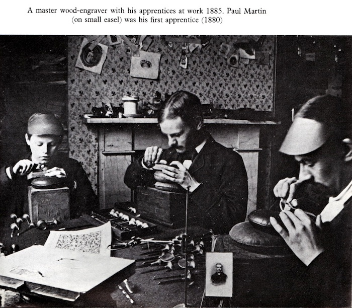 実は このポール・マーチンという人は最初から写真家を志していたわけではなく、16才(1880年)になるとまず木口木版画のエングレイバーとして働き始めま す。ちょうどそれから百年程前にトマス・ビュウィックが確立した印刷物の挿し絵を製作する工房です。エングレイバーとしての才能に非常に長けていた彼はす ぐに一流のエングレイバーとして活躍するようになりますが、その一方で当時実用化され始めていた写真機のネガを使った印刷技術がいずれは木版画にとって代 わるであろうことを敏感に感じ取った彼は、ある時点で写真家に転向することを選択するのです。