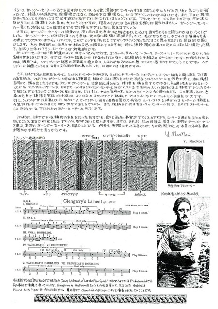 この、色違いの毛糸で模様を作ると言う手法は、より北方のスカンジナビア諸国や、アイスランドなどのニットと共通点が大で、特にシェトランドが以前属していたノルウェーのセーテスダール地方の民族衣装として有名なルース・コフタと呼ばれるセーターの模様との近似性は誰の目にも明らかだと言えるでしょう。また、輪編みで作る丸ヨークの形は、日本でもスキー・セーターとしてポピュラーなアイスランドのロピー・セーターとも似ています。 このように、日本で出版されている編み物の本(ムック)をひも解いただけでも、色々と面白い事実に気づかされるのですから、「セーターを通じた文化の流れ」なんてことを本気で研究しだしたら、随分と興味深いことだと思います。 でも、それよりまず、今の私の目標は「来冬こそは本物のガーンジー・ヤーンを使って、本物のガーンジー・セーターを編み上げる。」ということです。何事も、眺めているだけでなく自らの手で実際にやってみることこそが、その伝統文化の本質にふれる最も手短な手段だと思うからです。 Yoshifumick Og MacCrimmori