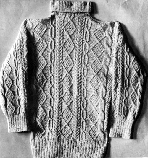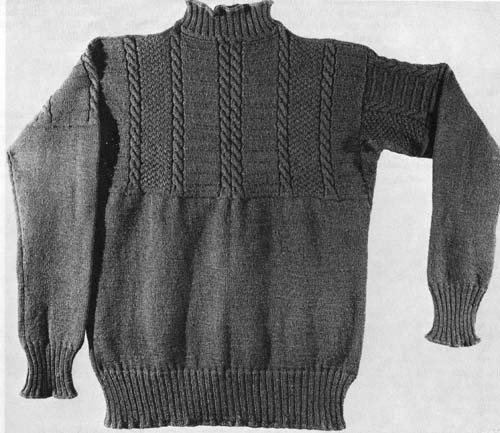 ガーンジー・セーターの古さを示すもう一つの例としては、その昔、漁師がセーターの裾をズボンの中に入れていた頃の名残りが残っていて、模様入りの場合でも、総模様ではなく胸から下は模様なし、というデザインのものが多いということです。アラン・セーターもごく古いものでは同じ様に胸から下には模様を入れなかったということですが、現在のものにはその様な名残りは見られません。ガーンジー・セーターの一見した特徴はこの胸部分での切り替えデザインだとも言えるでしょう。