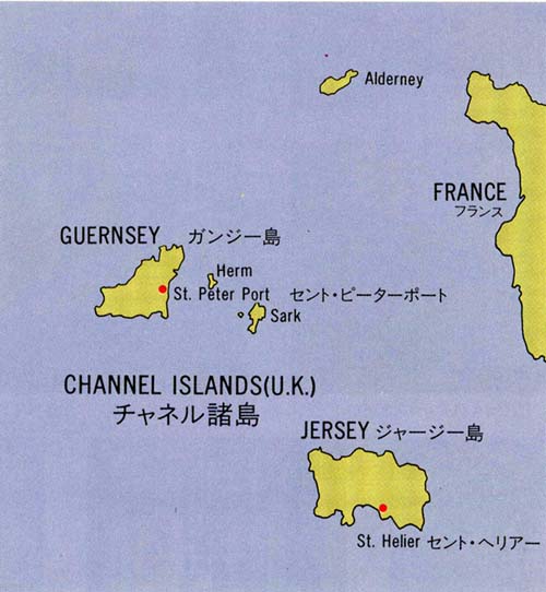 さて、俗に「アラン模様」と呼ばれている編み込み模様は、それぞれ「ケーブル」「ダイヤモンド」「生命の木」「ハニーカム」などの名称が付けられていて、それなりの意味が込められているのです。いわく「ケーブル」は漁師の使うロープを表し大漁を願い、「ダイヤモンド」は成功と富を象徴し、「ハニーカム」は骨の折れる仕事に対する報酬を、「生命の木」は長命と丈夫な息子の誕生を願うといった具合です。これらの模様は、アラン島の人々によって何代も受け継がれてきたごく素朴なFolk Art と言えるものですが、興味深いことにこれらの模様にケルトの石の遺跡にみられる渦巻きや菱形の模様と何となく良く似ているものがあるということです。まさか、ケルトの時代からこれらの模様が編み続けられていたとは考えられないでしょうが、アラン島の人々が模様編みのモチーフを身の回りに求めた時、海に関するものだけでなく、ケルト人の残した模様からインスピレーションを得たとしても決して不思議ではないでしょう。 アラン・セーターについて伝えられていることがもう一つあります。それはアランの女たちは、夫や恋人が万が一海で遭難したとしても遺体がすぐに判別できるようにと、各々の編み手が独自のパターンをあみ出したいったという話しです。厳しい北国の生活が偲ばれるような気がします。 アラン島のフィッシャーマン・セーターも元々は漁師たちによって海伝いに伝えられてきたものですが、そのルーツとも言えるセーターが、イギリスとフランスの間に点在するチャネル諸島のガーンジー島を起源とする、ガーンジー・フィシャーマン・セーターです。ガーンジー島は、 チャネル諸島では、いつの頃からかニット産業が盛んになり、最盛期の16-17世紀には、フランス、スペイン、イギリスなどへ靴下やチョッキなどを大量に輸出していたそうです。スコットランドのメアリー女王が処刑された時には、ガーンジー製の靴下を履いていたと言われているそうです。 しかし、盛んだった両島の手編みニット産業も、18世紀を迎えてからは、産業革命による機械ニット産業の出現やフランスのニット製品への課税措置などによって衰退の道をたどることになます。しかし、その中から、ニット産業に続いて19世紀中期のチャネル諸島の中心的な産業となる造船業や漁業のために、長年つちかってきたニット技術を活かしたフィシャーマン・ガーンジー・セーターが生まれる訳です。 ガーンジー・セーターは、アラン・セーターと同様に、海に関する様々な模様などを編み込んだセーターですが、この2つのセーターはその模様の編み出し方が決定的に違っています。 編み物には表目と裏目が出来るのですが(普通のセーターの表側に出ているのが表目で、裏側になっているのが裏目です。)、アラン・セーターは裏目の地に表目で模様を浮き立たせていくのに対して、ガーンジー・セーターでは表目の地に裏目で模様を作っていくという、正反対の方法を取るのです。この違いについては一見どちらが古いかということははっきりしない様に思えますが、2つのセーターを比べてみると、アラン・セーターの方法の方が模様がよりはっきり浮き出て見えることは一目瞭然ですので、アラン模様はガーンジー模様に飽き足らなかったアラン島のある人が考えだした、より進歩した方法だと考えて良いのではないでしょうか。