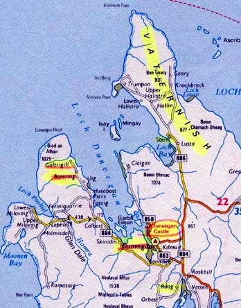とにもかくにも、16世紀初頭か遅くとも半ばにはマクリモン一族はどこからかスカイ島に移り、ダンベイガン湾のほとり、マクロードの居城であるダンベイガン城から4マイル程の地、Galtrigall に住みついたということは確かなようです。