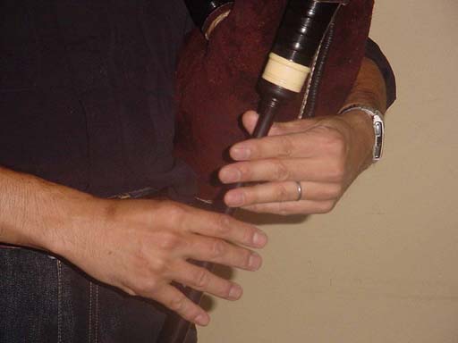 た。)で作った空気を蓄える袋に息を吹き込み、それを脇に抱えひじで押しながら途切れることなく音を出し続けます。蓄え
