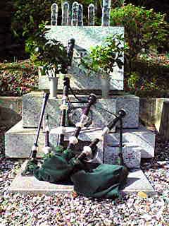 パイパー森はかねてから、小田原にある松平さんの墓前で鎮魂の演奏を捧げることを思い描いていました。しかし、実際に はその思いはなかなか果たすことが出来ないまま、いたずらに数年間が経過してしまいました。 しかし、とうとう先日、今年の命日から数日経った19日の木曜日に休みを取り、長年の思いを果たしてきました。 小田原の市街地郊外の山を切り開いて作られたその霊園に続く、鬱蒼とした針葉樹の林を抜けるつづら折りの急坂を登り ながら「いや〜、こりゃ、いかにも松平 さんらしい場所に居を構えているな〜」と痛感。たどり着いた松平家のお墓は、眼下に小田原の街と太平洋が見渡せる素 晴らしいロケイションに位置していまし た。 松平さんに「いや〜、すんません、長い間待たせちゃて…」とあやまりつつ、墓前で、 "Lament for the Children" を 演奏。目をつむって淡々と演奏しながら、頭の中では松平さんと最初に出会った当時からのさまざまなシチュエーション が走馬灯の様に巡りました。 心を込めてこの19分間のラメントを演奏した後、一息ついてから、松平さんが特に好きだった軽快なマーチ、亡く なる直前にホスピスで最後のお別れをした際にも演奏した、アルビオン・カントリー・バンドでお馴染みの "The Battle of the Somme" を 演奏しました。思ったとおり、えらく喜んでくれたようで、例によってリズムを取るために「ボールペン貸して」って言 う様な声が聞こえた様な…。 今回は、お墓に眠る松平さんに敬意を表して、いつものようなピーブロック・ウォークではなくて、墓石に向き合っ て直立不動で演奏したのですが、その演奏の際にちょっと意外だったのが、いつもとはちょっと異なった音の響きでし た。 狭い室内で聴こうものなら、その暴力的な高音域の音量に誰もが辟易してしまうハイランド・パイプですが、本来の