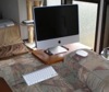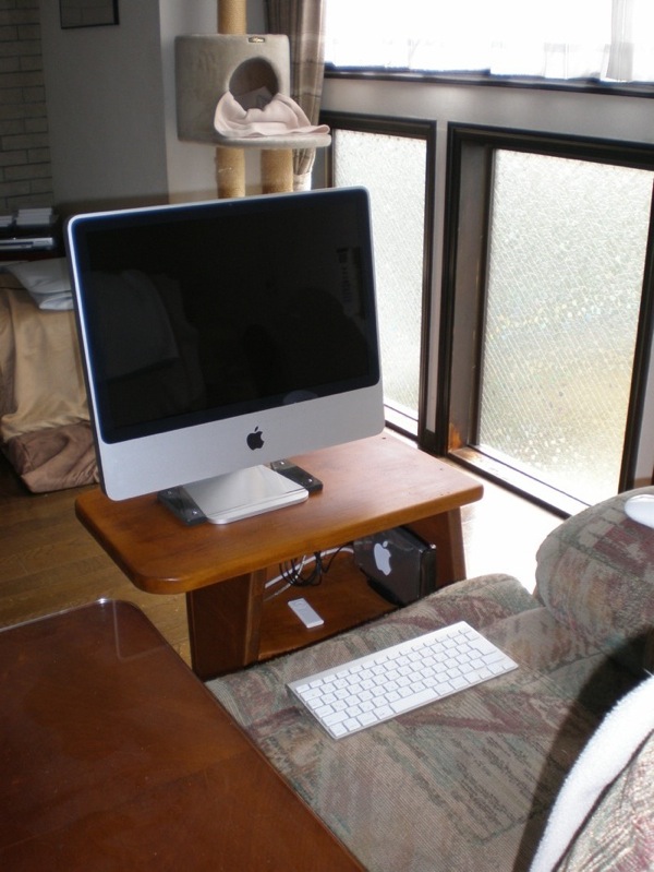 なか更新しなかったもう一つの理由に画面サイズの問題があります。 この10月に MacBook シリーズになって以来最大規模 のモデルチェンジがあり中身のみならずデザイン面でもかなり大幅に刷新されたのですが、残念ながら画面サイズに ついは従来の MacBook どおりに 13.3 インチのままで据え置かれました。 …で、更新するにしても「現行よりも画面サイズが小さくなるというのは、はて、いかがなものか?」と、じっくりと熟 考した結果、最終的に MacBook に 先行して2007年8月にビッグモデルチェンジ、さらに、今年5月にマイナーチェンジ(CPUクロック数アップ&プライ スダウン)して以来、その美しいデザインとコストパフォーマンスの高さで巷で大変に人気が高いと評判の、一体型デスク トップパソコン iMac の方を購入することにしました。 我が家では iMac については、あ の衝撃的なボンダイ・ブルーの初代(新聞の 全面広告にあのマシンがどっか〜んと載った時の鮮烈な印象は忘れられません。見た瞬間に「これ、買いッ!」とビビッと来 たものです。)と、それに続いてインディゴ・ブルーの 2代目を、ほんの2、3年前までノートパソコンと併用して使っていました。 この時代の iMac は、奥行きの あるブラウン管タイプのずんぐりむっくりした形状ですからやたらとスペースを取りますが、最新の iMac はまるでディスプレイだけかと思わせるようなな んともスリムなデザイン。画面サイズは最もベーシックなものでも 20インチもあり、かつ、新しい MacBook シリーズに比べても CPU も HD もワンクラス上のモノが載っていながら値段が安いとくれば、確かに「コストパフォーマンスが良い」と評判になる訳です。 私が購入したのは最もベーシックな機種ですが、オプションとしてワイヤレス・マウスとワイヤレス・キーボードを注文しま した。オンラインの Apple Store で購入すれば差額を支払うだけでそれぞれワイヤードのキーボードとマウスがワイヤレスのものに交換された上で送られて来 るので、安上がりかつ無用なものが ダブって付いてくる無駄がありません。 しかし、メモリについ て言えばベーシックなタイプに標準で搭載されているのはたったの1GB なので、最低でも2GB にしたいところ。ただ、メモリだけは Apple Store で購入すると相場よりかなり高価だということなので、Yahoo のオンライン・ショップで格安な4GB(iMac が対応する上限)のものをゲットしました。ちょうど Apple Store でオプション設定されている 2GB のメモリと同程度の価格でした。 初代&2代目の iMac についてはそのサイズからして当然ながら文字通 りデスクトップに置いて使っていましたが、今回購入した最新の iMac については、これまでのラップトップ・ノートパソコンに置き換わる形で使用するため、家に居る間の殆どを過ごすマイ・ソ ファー(アームレストにあるノブを引くと、オットマンが立ち上がり、同時に背もたれが倒せるようになる)に座った状態で 使えるようにする必要があります。 そこで、iMac が到着する前に、ラップトップに代わる役割を果