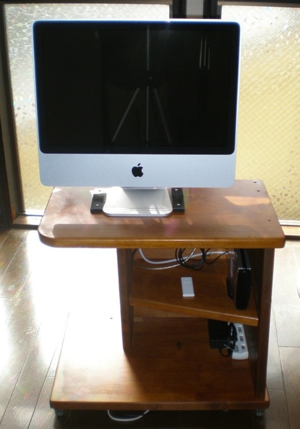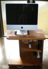 によってコロコロと目の前に移動させるのです。 スタンドアローンでし かもキャスターが付いた移動式ということで、地震の際には簡単に倒れてしまいそうなので、iMac のアルミ製スタンドをアクリル版でホー ルドするようにしてあります。また、膝元の棚上段には Mac OS 10.5 の売りの一つである自動バック アップシステム Time Machine 用 のハードディスク、棚下段には双方への専用電源タップを据えました。