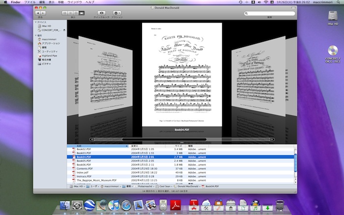れ、ファイルなどの閲覧にも使えるようになったことにより、その意味は全く異なってきました。 Cover Flow は、私がいつでもさっと取り出して参照したいためにドックに常駐させている Ceol Sean の復刻版楽譜集や pipes|drums のサイトからダウンロードした William Donaldson の解説付き楽譜類など、膨大な数の PDF ファイルを閲覧する際に特に絶大な威力を発揮します。 なんせ一冊の楽譜をまるまる写し込んだものですから、これらの