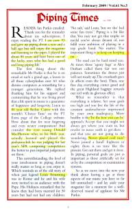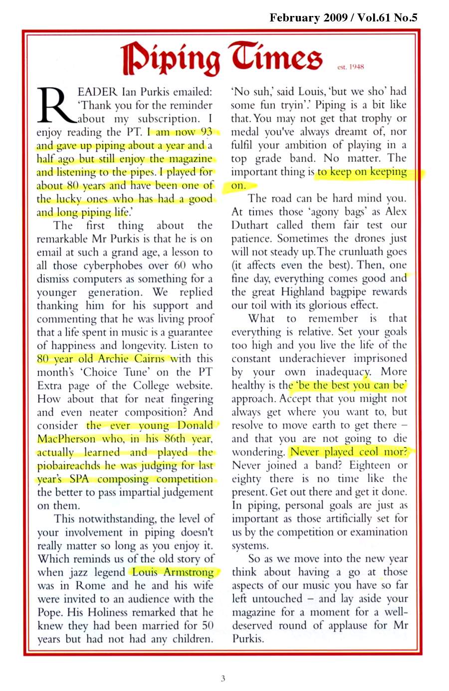 | 2月に紹介した後期高齢者パイパーの話題の続編?。2009年4月号の“Piping Times”に載っていた記事です。