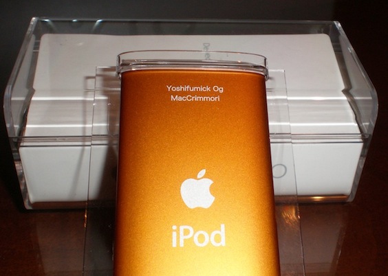 私は、最初に購入したマッキントッシュである Classic から始まり、ボンダイブルーの初代 iMac、そして、ちょっと進歩したインディゴ・ブルーの iMac、さらにシェル・シェイプの初代 iBook(色はオレンジ)、そして、ホワイト・ポリカーボネイトの iBook が家族の分3台と、全てのマックを捨てていません。どのマックもそれぞれの時代を反映した優れたデザインだから、ありきたりの電化製品と違ってどうしても捨てる気にならないのです。 ところで、パッケージデザインの話しとは関係ありませんが、オンラインのアップル・ストアでは、無料で iPod にメッセージをレーザー刻印してくれる特典サービスがあります。基本的には大切な人へプレゼントする際のお勧めサービスなのですが、私の場合は誰もプレゼ ントしてくれる訳ではないので、自分で自分の名前を刻印してもらいました。