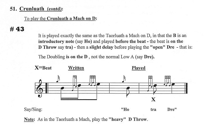の方が歯切れよく仕上がるので私は O-HiA を使います。 ●2nd ライン3小節目の E-(tr)HighA-HighG は指の動きが圧倒的に少なくなるので P-HiA を使うのがベター。 ●3rd ラインは以上のパターンを適用。 以上を参考にしながら、ご自身でも試してみて下さい。 (3)throw on D の Light と Heavy の使い分け その後、掲示板で bugpiper さんが次の様に投稿されました。 > I氏の師の一人、Hugh MacCallum は、Crunluath a Mach on D のみ Heavy で 演奏したとご本人から聞いたとのことです。 そこで、Archie Cairns の "How to" Piobaireachd Manual を紐解いたところ、確かにそう書いてありま した。