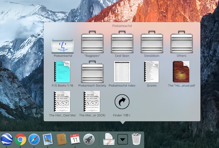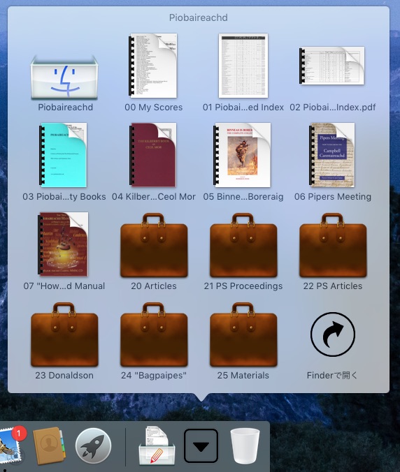 作業は少々手間でした。 そんなかんなで、今では我が家の3台全ての Mac のデスクトップと iPad のホーム画面から、アイコンをワンクリックするだけ「パイパー森特製」デジタル版 Kilberry Book が即オープン。そして、目次からワンクリックで望む曲の楽譜に瞬時にアクセス。大きく表示したければ画面を広げれば良い し、スクロールしたければマウスやトラッ クパッドの上をちょこっと撫でれば良し。終始キーボードに触れる必要も無く、段違いにストレスフリーになり ました。