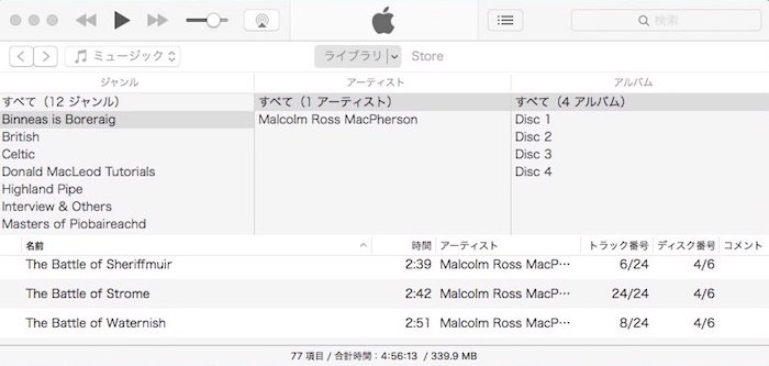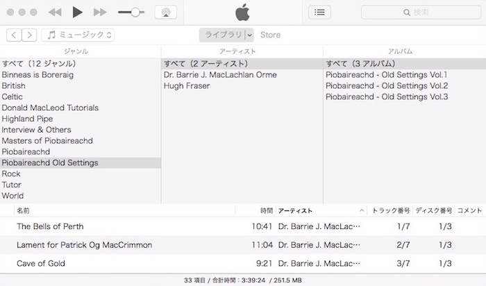 他の音源はごく普通のジャンル分けですが、ハイランド・パイプ関連の音源についてはジャンル分けとタグのつけ方に一 工夫しています。 まず、Binneas is Boreraig、Donald MacLeod Tutorials、Masters of Piobaireachd、Piobaireachd Old Settings というシリーズ音源は、それ自体をジャンル名にして独立させています。