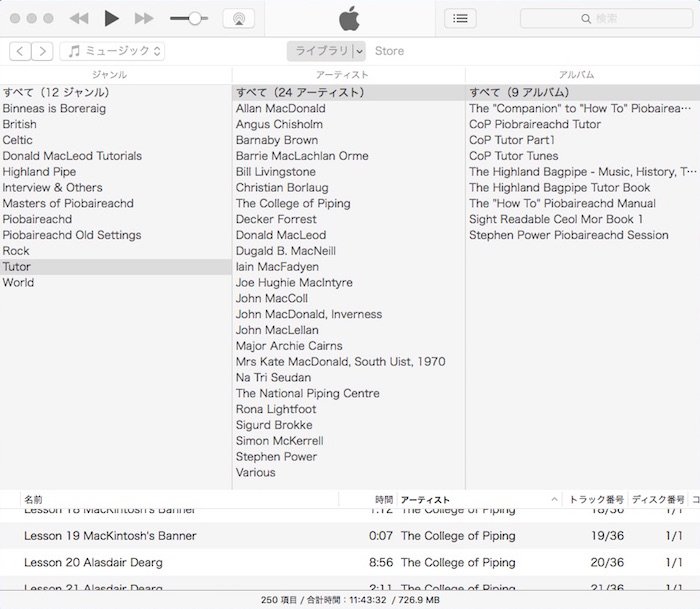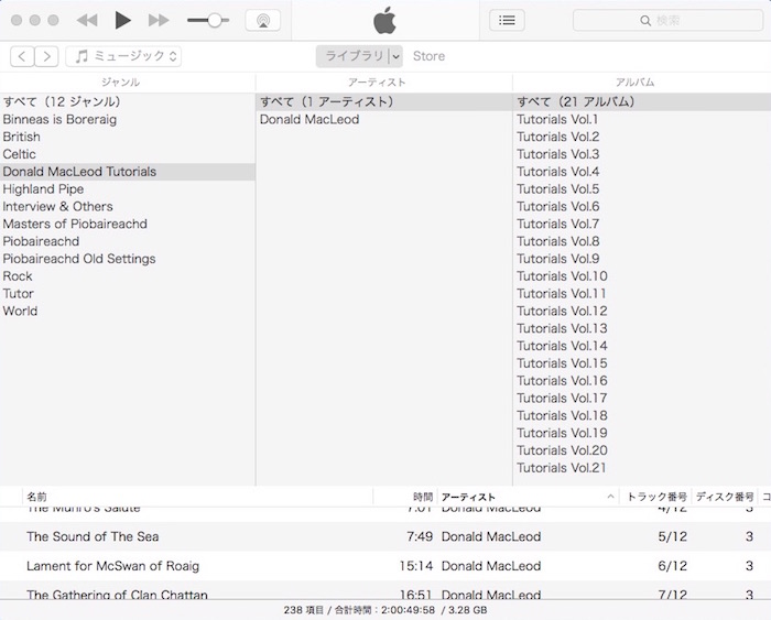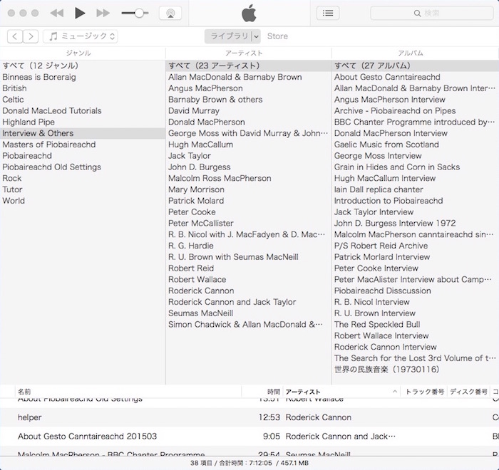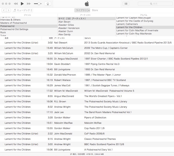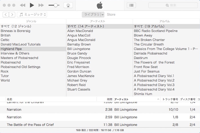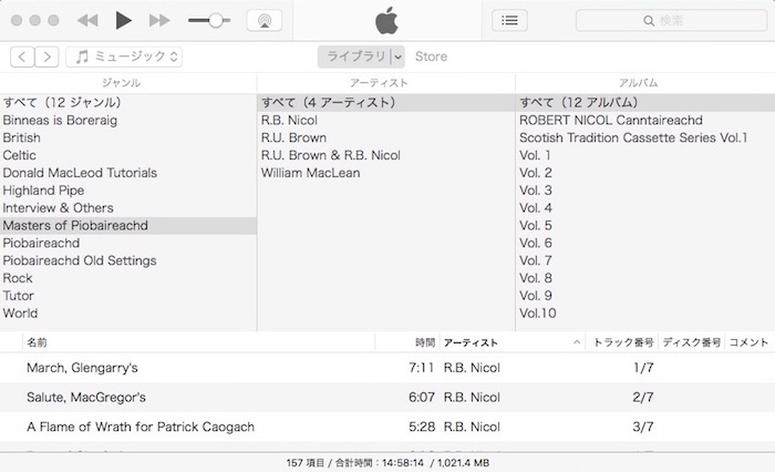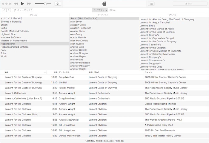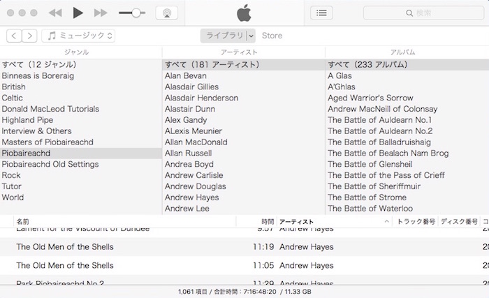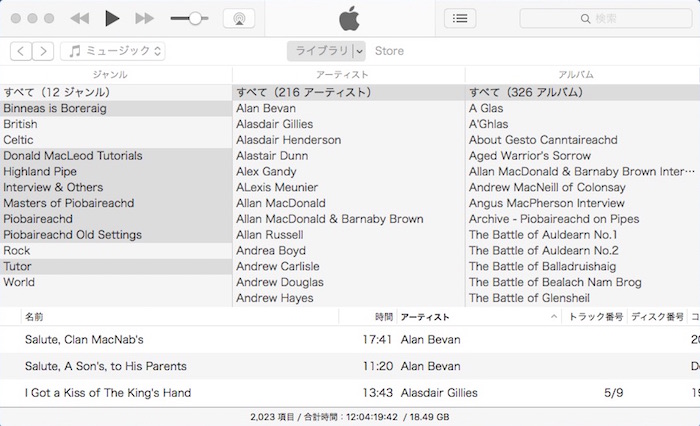 ただし、Acrobat Reader で作業完了した段階で、そのファイル を再度 iMac の Piobaireachd フォルダと i文庫HD のファイルと置き換える手間が掛かります。しかし、これだけ心地よい作業が出来るのであれば、まあ良しとするしかありま せん。もちろん「デジタル本が読 みやすく、本棚フォルダの体裁が良く、マーキング作業がし易い」といった三拍子揃ったアプリがあったら申し分無いのです が…。 1)iMac 音源資料は基本的にピーブロック以外の音源と一緒に iMac の iTunes で管理しています。iTunes では、全ての音源の分類が一目で解り易い、下の様なツリー形式のカラムブラウザをデ フォルト使用。 ジャンルは全部で12。ロック、民族音楽(World)、ケルト、ブリティッシュ・トラッドを除いたハイランド・パ イプに関するジャンルを選択すると次の様な具合。