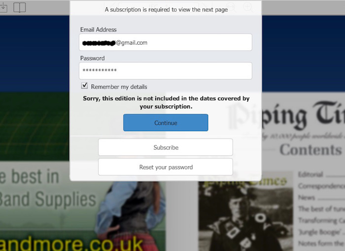"Piping Times" online Edition については、最後に報告した 2014年5月以降は平穏な日々(月々?)が続いていました。ところが、 先日4月1日のエイプリルフールに久しぶりにまたまたやってくれました。いつまで経っても退屈させてくれませんね。 前にも書いた通り、私の定期購読は毎年2月で終了します。今年もまた例年の如く「もういい加減購読やめようかな?」と 逡巡しつつも、結局「ま、いい か〜」と、2月号の配信のあった日に一年間の購読更新を手続き。そして、新しい定期購読期間の最初の号である3月号が3 月1日に無事配信されてほっと一安 心。 確かに、購読更新の手続き後には CoPからの注文確認のメールと PayPal からの領収メールが送られてきています。しかし、最終的に私の新しい購読期間を配信システムの中でリニューアルするのは CoP のスタッフの手作業だと想像されるので、その事が抜かり無く処理されて実際に配信されるまでは決して安心できないので す。 さて、そんな不安感も無くなったところで次の4月号がスケジュール通り4月1日(金)に配信。ところが、ログインし ようとしたら、なんと次のようなメッセージが…。