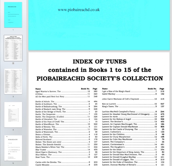 Numbers という MacOS の表計算ソフトのファイルです。元データは確か Ceol Sean の Steve Scaife 作だったと思います。 02 Piobaireachd Index : 同じ内容の PDF版 03 Piobaireachd Society Books : Book 1〜16 の自家製デジタル版 04 The Kilberry book of Ceol Mor : 自家製デジタル版 05 Binneas is Boreraig : 自家製デジタル版 06 Pipers Meeting: