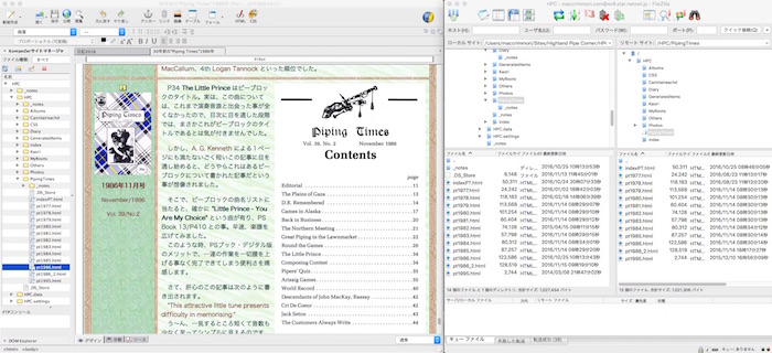 WYSIWYG」画面/右は FTPウィンドウ 良いソフトが手に入って嬉しくなり、まだ11月半ばなのにも関わらず、物は試しと KompoZer を使って "Piping Times" 1986年12月号の記事を作成してみ