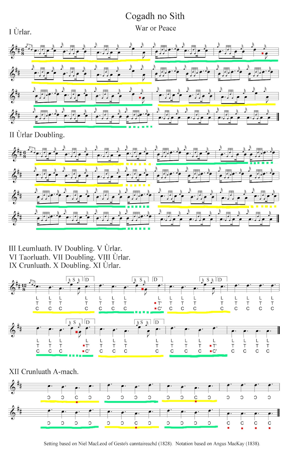 の練習に励む事にしました。この曲は構造やその他の装飾音は極めてシンプル。構造を覚えやすくスコアに色付けし、注意すべき箇所に赤ドットを付けると こんな具合。(→クリックで拡大) Patrick Og 習得に 20年掛かり、Daughter's には既に数年かけても未だ習得できない程に音感の悪いパイパー森でも、これなら直ぐに頭に入ります。こ れほどにシンプルな曲は、私のレパートリーの中ではこの他に "The Battle of Audern No.1" だけ。 ですから、この曲の練習はあくまでも "Redundant A" が入ったオールドスタイル Taorluath & Clunluath の習得が主眼となります。とにかく、全編通して FarEastPiper さんの言う通り「グリップ+α 」の連続ですから、オールドスタイルの指遣い練習曲としてはこれ以上の曲はありません。 最初は Jack Lee の演奏の半分程のスピードから始めて、丁寧に丁寧に練習していると、徐々徐々に、でも、確実に "Redundant A" を際立たせた Taorluath & Clunluath が表現出来る様になって来る手応えを感じます。 目指すは、"Piping Press" のこのページに挿入されているこの音源の中で Robert Reid が実演している様に明瞭な Taorluath & Clunluath の表現。完璧に習得できた暁には William McCallum が演奏する "The Daughter's Lament" に於ける Clunluath の忠実な再現ができる事を期待しつつ…。 "Low A" が有るか無いかで Taorluath & Clunluath がこんなに違うにも拘らず、20世紀初頭の権威者たちは、この "Low A" を "Redundant(不必要な)A" として排除しようとした事は、極めて悪質な犯罪行為と言えるでしょう。この "Low A" は "Essential(必 須の)A" そのものです。この "Low A" の存在によって、Crunluath と Crunluath-a-mach の表記も、少なくとも音数は同じになり、タイミングを除けば音の並びはほぼ似通ったものになります。結果として、 Crunluath-a-mach は単なるタイミング違いの変化型の装飾音となり、却って習得し易くなるのではないでしょうか? ⇒ Traditional Taorluath and Crunluath Robert Reid の言葉の中に "properly taught" と言う言い回しが繰り返し出て来ますが、正に これが「正しい教えられ方」の様な気がします。 Clunluath-a-mah の話が出たところでこの装飾音に関するネタを一つ。 "The Battle of Audern" と "War or Peace" の両者が共通 して覚え易い理由の一つとしては、キーノートが BCD に集中している事があります。Patrick Og や Daughter's の様なトップハンドの小難しい装飾音が殆ど登場しないのです。ただし、それは同時に「Clunluath-a-mah がやたらと連続する」という事を 意味します。 →は "The Battle of Audern" の