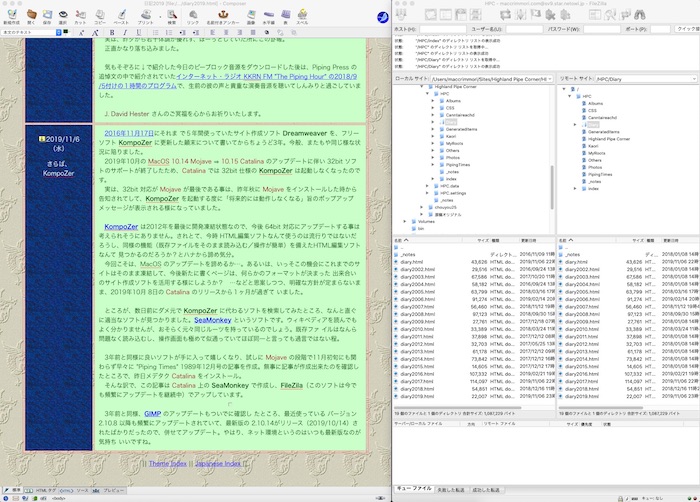 ソフトのサポートが終了。KompoZer は 32bit 仕様なので Catalina の環境では動作しないのです。 実は、32bit 対応が Mojave で終了する事は、昨年秋に Mojave をインストールした時から告知されてして、KompoZer を起動する度に「将来的には動作しなくなる」旨のポップアップメッセージが表示される様になっていました。 KompoZer は2012年を最後に開発凍結状態。今後 64bit 仕様にアップデートする事は考えられません。つまり、また新たな 64bit 仕様の代替えソフトを探さなくてはならなくなったのです。されとて、今時HTML編集ソフトなんていうものは流行りではないだろうし、同様の機能(既存の HTML ファイ ルをそのまま読み込む/操作が簡単)を備えたソフトなんて有るのだろうか?と早々に諦め気分。この1年間、真面目に代替えソフトを探すという努力すらしま せんでした。 そして、迎えた今年10月。今度こそは macOS のアップデートを諦めるか? それとも、この機会にこれまでのサイトはそのまま凍結。今後新たに書くページだけを何らかの定型フォーマットが決 まった出来合いのサイト(ブログ)作成ソフトを活用する様にしようか? …などと思を巡らせる日々。いつまで経っても明確な方針が定まらないまま、10月 8日の Catalina のリリースからあっという間に1ヶ月が 過ぎました。 漫然と過ごしている中、数日前に何気に KompoZer に代わるソフトを検索してみました。そうしたところ、なんと直ぐにドンピシャのソフトが見つかったのです。SeaMonkey というソフトです。私に仕組みは理解出来ませんが、一つのソフトの中にウェブブラウザ、電子メール等と一緒に、 Composerと呼ばれる WYSIWYGのHTML編集ツールが含まれているとの事。私はその Composer 部分の恩恵にあずかる訳です。おそらく KompoZer と同じルーツを持っているのでしょう。既存ファ イルはなんら問題なく読み込むし、操作画面も極めて似通っていて、ほぼ同一と言っても過言ではない程。3年前にドタバタした 時の事を考えると、今回は余りにも容易に解決してしまったのでちょっと拍子抜けです。 ![]() 前回と同様に良いソフトが手に入って嬉しくなり、macOS は Mojave のまま、11月初旬にも関わらず早々に "Piping Times" 1989年12月号の記事に取り掛かってみました。新たなページ作成も過去のページ編集もトラブルなく出来る事を確認したところで、昨日メデタク Catalina をインストール。 以上の様な顛末で、この記事は Catalina 上の SeaMonkey で作成し、FileZila(このソフトは今でも頻繁にアップデートを継 続中)でアップしました。 3年前と同様、ついでに日頃から画像処理でお世話になっている GIMP のバージョンアップ状況を確認したところ、最近使っているバージョン2.10.8 以降も頻繁にアップデートされている様で、 Catalina の リリース直後の10月14日に最新版の 2.10.14がリリースされたばかりでした。そこで、早速アップデート実行。 今回のサイト作成ソフト更新もなんとか無事に乗り越えられて、ホッとしている所です。 |