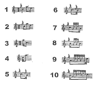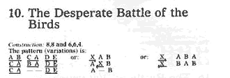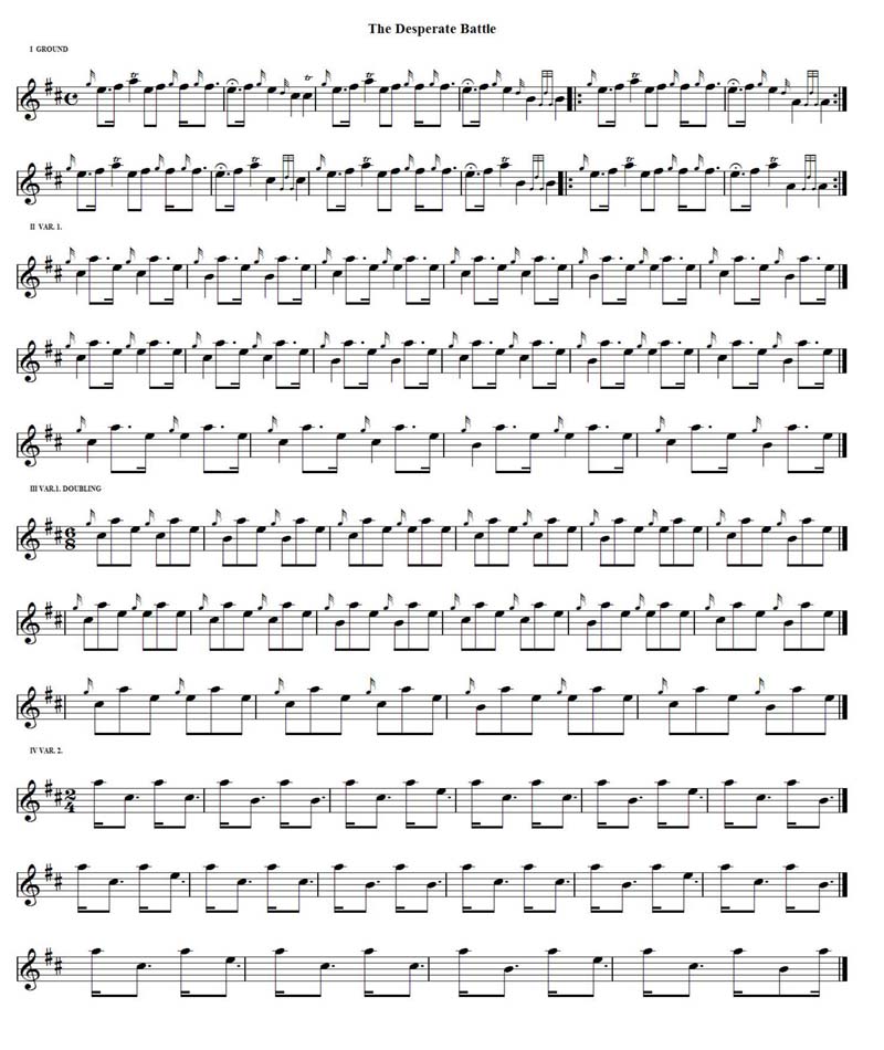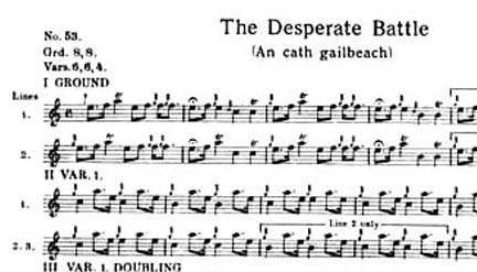 The Desperate Battle of the Birds 現代に伝えられているピーブロックはおよそ300曲以上ありますが、一番多いのが Lament〜 つまりは誰某の死を悼んだ曲。そして、その次に多いのが、Salute〜 つまりは誰某の誕生だとか偉業を讃えた曲。大体これでおよそ70%位でしょうか。その他に、Battle of〜 なんていって、クラン同士のある戦いのことを伝える曲、Gathering of〜 といってそれぞれの クランの定番ナンバーなんかもあります。あるいは Nameless なんてのも有ります。そういう場合に は例えば "Hiharin Dro O Dro" といったように便宜的に最初の一小節のカンタラックをそのまま曲名にしてしまい ます。 それらの曲はテーマはなんであれスコットランドの風土から生まれてきたものなので、スコットランドの自然風 景にはすごく馴染む曲調なんですが、実は直接的に自然の情景をテーマとして描いているといわれるピーブ ロックはあまり聞いたことがありません。そういう意味から言うと、この "The Desperate Battle of the Birds" はその特殊な例の一つです。 こ の曲は "The Birds' Fight" という名で呼ばれることもあり、描かれてのは次のような情景です。 「ある静かな夏の日、鳥たちが2羽3羽とさえ ずりながら集まり始める。そして、鳥たちが増えるに従って静かな歌声から徐々に歌合戦になり、ついには凄まじい (鳴き声の)闘いへと展開していく。そして、突然何かに驚いたかのように全ての鳥が一瞬にして飛び去り、再び平 和な夏の日の静寂が訪れる。」 私の手許にはカンタラックも含めて全部で9つの音源がありますが、大体演奏時間は12分程です。 楽譜は次のとおりです。(score by bugpiper) 実はピーブロックの構造の説明をする例としてはこの曲はあまり適切ではありません。 Kilberry Book の楽譜の左上にある Grd 8,8. Vars.6,6,4. というのがそのパターンを示している記号で、ウルラールが「8小節+8小節」、バリエイションが「6小節+6小節+4小節」という構造になっている、とい う意味です。 ちなみに "Lament for the Children" の場合はただ、8:,8,8. と書いてありますが、これは、ウルラールもバリエイションも両方とも、「8小節の繰り返し+8小節+8小節」というパターンだという意味です。
