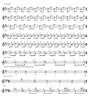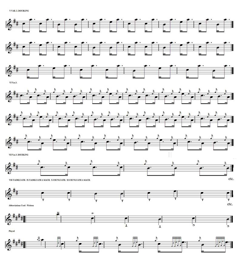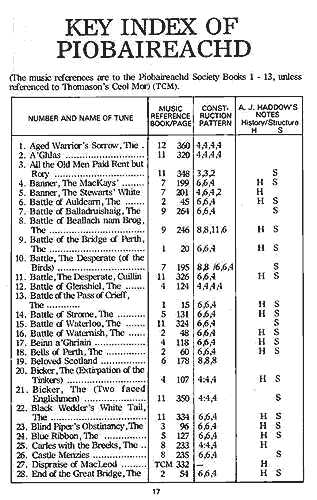 そして、このパターンにこのような装飾音が付けられて演奏が続いていくのです。 さて、以上は Seumas MacNeill の "PIOBAIREACH" からの引用です。一方で、 A. J. Haddow の "The History and Structure of Ceol Mor" (1982)では、 当時出版されていたピーブロックソサエティーの楽譜集 Vol.1〜Vol.13 までのピーブロック194曲(この楽譜集は現在ではVol.16まで出版されています。)についての構造パターンを一覧表にするとともに、その内およそ半数の曲についてはその曲の歴史 背景について記述。その内およそ2/3の曲については一覧表に掲げられたパターンの中身について詳しく解析されてい ます。