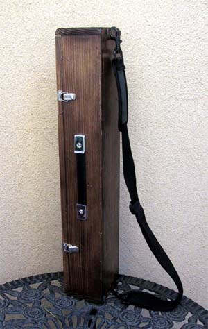 全景です。外寸は10cm×10cm×63cm。15mm厚の板を使っていますから、内寸は結果的に7cm×7cm×60cmに成ります。肩に欠けられるように取り外し自在のショルダーベルトを付けてあります。