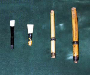 当然、その昔はパイプチャンターと同じケーンを使ったものだったのでしょうが、一度バッグに溜められて余分な湿気が抜けた空気によって鳴らされるパイプチャンターリードと異なり、直接口で吹く息にさらされるプラクティスチャンターではリードは直ぐに水分を含んでしまいますので、多分音程はすぐに不安定になっただろうし、またリード自体の寿命も非常に短かったのではないでしょうか。想像するだけでもいやになっちゃいますね。
