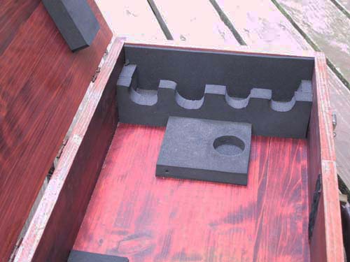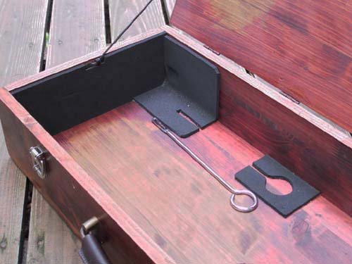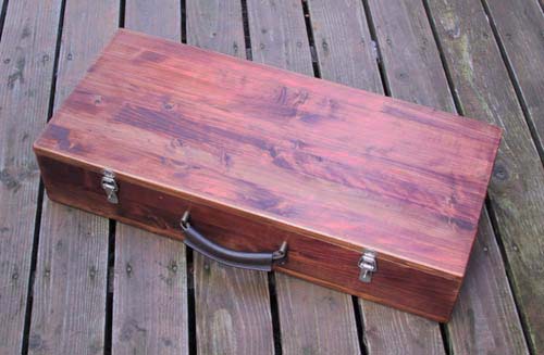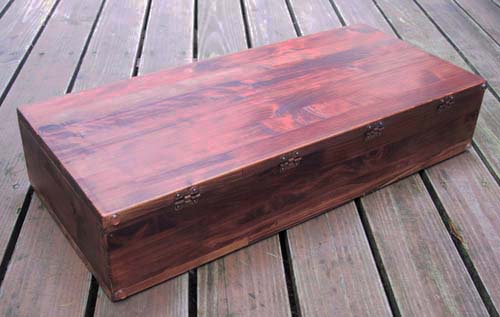第7話(2002/8) 木製パイプケースの話 今回は、ハイランド・パイプを収納するトラディショナルな木製パイプケースの話しです。 しかし、パイプ自体については、なんといっても木製のケースが一番伝統的なスタイルです。そのことについては、 Canntaireachd No.14 (1995年)でも触れています。…が、さらに言えば、そこで挿し絵として使わせてもらったフレッド・モリソンのCDジャケット写真に写っているような、断面がほぼ正方形に近い直方体をしたものがもっともオーセンティックなスタイルです。 とは言っても、私が自分のパイプを手に入れた20数年前は、バグパイプを入手する際にケースも一緒に輸入するということはあまりしなかったので、当時の東京パイピング・ソサエティのメンバーたちはバグパイプのケースとして、アルトサックスのケースを流用するのが一般的でした。 それ以来、20年以上もそのケースを愛用していたのですが、実は断面が真四角に近いトラディショナルなケースってのは、つまりは幅(というか奥行きというか)がかさばるので、混んだ電車などで移動するときには、甚だ具合が悪いんです。 一方、インターネットであちこちのバグパイプ関係のディストリビューターのサイトで、バグパイプ・ハードケースのリストを眺めてみると、やはり伝統的な直方体に近い木製パイプケースなんてものは全く見かけることが無く、どちらかというと、より平べったい形をしていて、素材もアルミのものが主流です。 う〜ん、そこで、あのプラクティス・チャンターケース作りで自信をつけてしまったパイパー森は、この際、より機能的でかつ伝統的な木製ケースを製作することにしました。 そんな訳で、例によってパイパー森御用達の東急ハンズ新宿店で材料を調達して作ったのが次のケースって訳です。(写真は全て大きくなります) 木材売り場で適当な材木を物色した結果、丁度良い雰囲気の色にステイン着色済みの厚さ14mmの檜の集成材を見つけました。