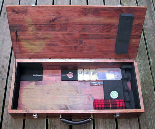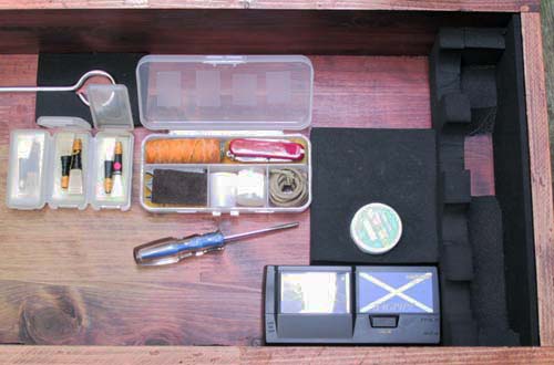 ツール類のクローズアップです。 バグパイプ・チューナーも通常はチャンターと同じタータン柄の袋に入れています。