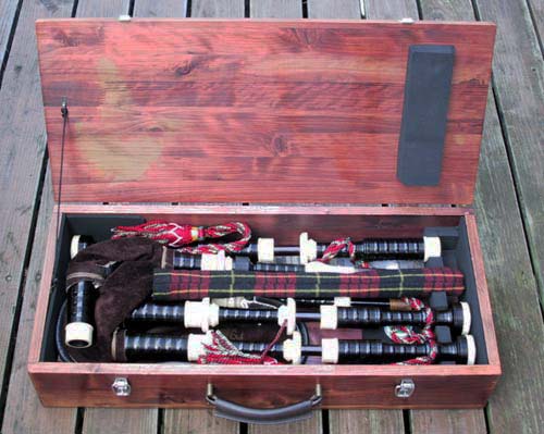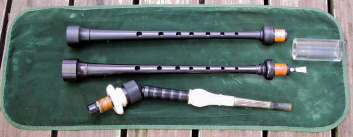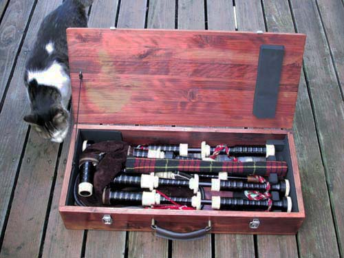 上がプラスティック、下がウッドです。当然ですが艶が違います。でも、プラスティックのチャンターも、なかなか良い味わいでしょう。 右側に見えているアクリル製のリードキャップはもう25年程使っているけど、全くくもったりしない山根先生作による優れもの。海外のどんなパイパーも持って無い…。 一番下に見えているのは、これまた優れもののユニバーサル・ジョイント付きの「曲がるブロー・パイプ」。演奏しているカッコはあんまり良いとは言えないけど、このお陰で演奏は随分楽になりました。こんなブローパイプが工夫される以前は、疲れてきて口が閉まり切らなくなった頃には、なんとかして口から逃げていこうとするブローパイプを押さえ込むだけでも大変でした。 今回、こうしてパイプケースのことを書いてきて思ったのは、ハイランド・パイプってのは原始的な楽器だけあって扱うのがとても楽しい。そして、楽器の構造から言って、ケースにもこのように様々な工夫ができるってのもこれまた楽しい。 う〜ん、何と言ってもハイランド・パイプは楽しいよ〜。 |
