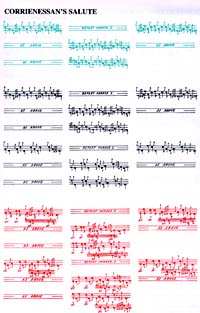 its soul." 元々、ピーブロックを紙の上で表す事は邪道と言えば邪道。そうかと言って、20紀半ばにもなって紙に書いた楽譜を全て否 定するのも時代錯誤なことでもあり ます。マクリモンの演奏を直系で伝承してきたマクファ−ソンのパイパーとしてのジレンマが、この言葉に全て込められてい るように思えます。 著者はこの Angus Macpheson の 言葉を尊重して縦のバーを削除。その代わり、通常の2小節分を一つのフレーズとしてまとめて表記するとともに、その長さ を常に一定に保って表記するように しています。つまり、他の楽譜ではごく当たり前に行われるような、一列に収まる小節数を変化させて(つまりは均等割りし て)楽譜の左右の列を合わせるよう なことはしないのです。ですから、楽譜は列によって凸凹していますが、その代わり、その構造は一目で分かる訳です。 さらにもう一つ、曲の構造を一目で分かり易くするシステムとして「ウ ルラールは緑、普通のバリエイションは黒、タールアー とクルンルアーは赤」と いういう仕分けで譜面を色分けしていることです。想像してみてください、1959年当時にハイランド・パイプの演奏を テープレコーディングしたということ もさることながら、このような楽譜がカラー印刷で出版されていたということ自体もスゴイことですよね。古臭いイメージと は裏腹に、実はこの楽譜は当時の最 先端の技術を駆使して製作されたと言えるのかもしれませんね。 また、このフレーズ毎の表記というシステムに加え、あるフレーズが前に出て来たフレーズと同じ場合には、"AS ABOVE " とか、"REPEAT PHRASE 1." というような指示が記さ れ ていて、繰り返しの並び方などが分かり易くなっています。 これらの様々な工夫により、この "BINNEAS IS