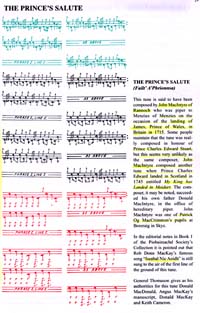 "BINNEAS IS BORERAIG" と いうタイトルのこの楽譜集が初めて出版されたのは1959年のことですから、それからまだ僅か40年余りしか経過してい ない訳で、ジョセフ・マクドナルド の本のように250年も前の本が復刻されたという程にはインパクトは強くはないかもしれません。しかし、ピーブロック愛 好家にとって、実際の演奏面でのそ の価値は、それに勝るとも劣らないものがあります。 ゲ−ル語のタイトル "BINNEAS IS BORERAIG" と は "Melody and Boreraig" という意味だそうです。もちろん、 Boreraig というのはスカイ島のはずれに位置するマクリモン一族の居住地、スコットランド中から多くのパイパーがマクリモンのその優れた技を学びに集まってきていた 有名なパイピング・カレッジがあった土地の名前です。 実は、この "BINNEAS IS BORERAIG" は 1990年に一度、今回と同様にカレッジ・オブ・パイピングにより「復刻されかかった」こ とがあります。その時は、まず全6巻だったオリジナルの第1巻だけが復刻され(パイパー森はもちろん購入しました)、そ れに続いて全ての巻が順次復刻され ることになっていました。しかし、何故か第2巻以降はいつまでたっても復刻されることなく、そのままいたずらに時が経過 していました。