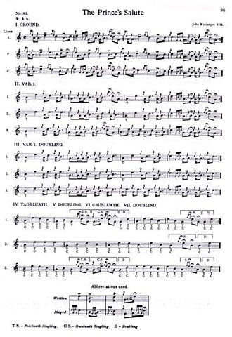 んだ?」と不思議に思っていたので すが、新しい復刻版の序文にその理由が書いてありました。 この楽譜集の大きな特徴の一つは、他の多くのピーブロック楽譜集が、ある特定の個人の演奏を表わすものでは無いのに 対して、これはあくまでも Malcolm Ross MacPherson (1907〜1966)という一人のパイパーの演奏を忠実に表 したものであるということです。著者である Dr. Roderick Ross は、このパイパーの112曲の演奏を全て テープに録音して採譜していったということです。 そして、ここでさらに重要な事は、このこの Malcolm R. MacPherson は単なるこの時代の一人のパイパーというだけでなく、マクリモンの演奏を直系で受け継ぐマクファーソン一族の末裔にあたる人物であること。つまり、この楽 譜集は往年のマクリモンの演奏への掛け橋となる重要な 役割を果たしているのです。