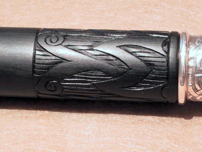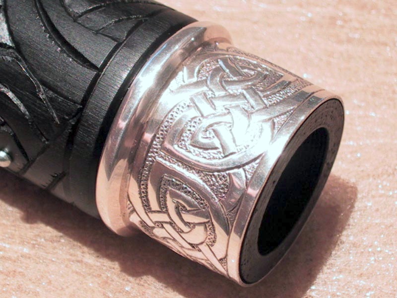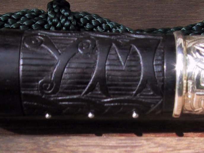 そして、何度見ても惚れ惚れしてしまうのですが、このシルバー Ferrule に施された Hand EngravingによるCeltic Knot と、アクセントとしてシルバーの鋲が打ち込まれた Hand Carving と Dirk Handle Designのとのコンビネーションは、Dunfion Bagpipes のカタログの中でも最高の組み合わせであると、個人的には強く確信しています。 ちなみに、世にパイプメーカー沢山有れど、Dunfion Bagpipes の Henry Murdo さんしかやらない、このブラックウッドへの手彫り彫刻という技ですが、自分自身でパイプ造りを楽しまれているという例の関西のAさんによると、「アフリカン・ブラック・ウッドというのは非常に堅い木だから旋盤で削るだけでも大変。まして、それに手で彫り込みを施すというのはちょっと普通じゃ考えられない。Henry さんの外にはそんなことをするヤツはおらへん。」と言っていました。そんな話を聞くと益々、Henry さんのこの丹念な仕事ぶりも、ついつい超高倍率のルーペで眺めてはつくづく感心してしまう毎日です。
