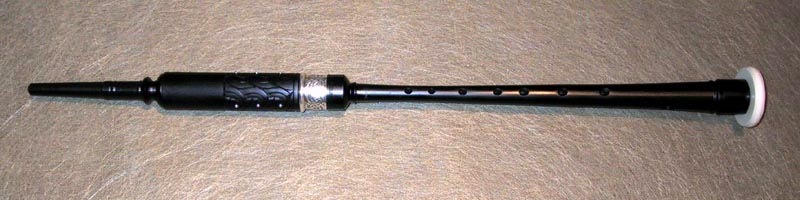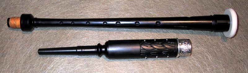 最初にその写真を見た時、すでに Dirk Handle デザインについては一目惚れしていた私ですが、さすがにこのプラクティス・チャンターには「いくらなんでも、こんなもん、一体誰が買うんじゃい?」「わざわざ、プラクティス・チャンターにこんな装飾するなんて全く意味無いじゃん?」というのが正直な印象でした。 し、しかしです、一転して自分自身が Dirk Handleの彫刻を施した Dunfion Pipes のオーナーになった途端に、この明らかに装飾過多だと思わるプラクティス・チャンターの意味するところが、まるで霧がすっかり晴れたかのようにハッキリと理解できるようになりました。< つまり、この“Dirk Handle Style Chanter”は、他のパイプとは全く異なるユニークな外見を持った Dunfion Pipes の虜になってしまった者にとっては、自分が所有するパイプ自体のレプリカ的な意味から欠かす事の出来ないコレクターズ・アイテムに成り得るって訳なんですね。 それは、例えればフェラーリのオーナーが自分の車の(時には数万円もするような)ミニチュアのレプリカを机上に飾って悦に入る、という精神構造と共通しています。 また、例えばメロディオンの卓越した演奏者でありパイパー森の古くからの音楽仲間であるメロディオン米山さんの場合は、さまざまな蛇腹楽器とアコ弾き人形の膨大なコレクションを自宅応接室の壁面一面に作り付けたガラス張りの収納家具に納めて悦に入り、日夜それらを眺めながらニンマリしています。 あるいは、ギター愛好家の中にも、コレクションのヴィンテッジ・ギターをいつでも鑑賞できるようにと、特注の回転式のガラス張り展示ケースをリビングに設えている、なんて話しも見聞きすることがあります。 このような人たちに比べてパイパーの場合は、パイプを演奏しない時にパイプケースを開けて、パーツの一部を手に取ってオイルで拭いたり、銀を磨いたりしてパイプを愛でることは出来ますが、まさか、その後で壁に飾っておくわけにもいかないし、一旦ケースの蓋を閉めてしまうと残念ながらその姿は拝めません。蓋をガラス張りにするって訳にも行かないし…。 そのようなパイパー森にとって、この“Dirk Handle Style Chanter”を、指の練習、曲の習得をするためというよりも、パイプ本体の身代わりとしていつでも座右に置いておくためにどうしても欲しくなってしまったのです。 多分、今後も曲の練習はこれまでどおりサイレントなテクノチャンターでやることになるだろう、ということは重々分かっているにも関わらず、一方でパイパー森の頭の中では次の様なイメージがすっかり出来上がってしまいました。 「Dunfion Pipes でお気に入りのピーブロック2、3曲演奏。良い汗をかいたところでパイプを丁寧にケースに仕舞って風呂に入る。風呂上がりに案楽椅子に座ってタリスカーのグラスを片手にテレビでも見ながら、気が向くままに“Dirk Handle Style Chanter”を手に取り、Dirk Handle の彫り込みを愛で、本体のブラックウッドをオイルを含ませたクロスで拭き、ケルティックな組紐模様が彫り込まれたシルバーを銀磨き用クロスで磨き上げる。」 う〜ん、これ以上至福な時の過ごし方がありましょうか! …で、「即断・即決・速攻」を一番の信条にしている(ニ番目は「前例不踏襲」、三番目は「他人の物まねはしない」)パイパー森は、早速、その晩のうちに Henry Murdo さんあてにメールでオーダーを出しました。 当然ですが、レプリカとしての完璧を期するためにリードキャップの Dirk Handleのデザインの中にはパイプと同様に私のイニシャルを彫り込んでもらうように、また、デザイン・ギャラリーに出ているチャンターでは、ステンレスのプレイン仕上げ(?)になっているように見えるリードキャップの Ferrule を、パイプと同様にシルバーにケルト組紐模様の彫り込みをしたものにしてもらうように依頼しました。 例によって、Henry さんからは翌朝までには返事のメールが入っていました。もちろん、彼はこのオーダーも快く引き受けてくれ、私の問いに答えてチャンター本体、彫刻の手間、シルバー Ferrule 各々のコストを伝えてくれました。送料については「今は分からないので送る際に送り状に書くから、荷が到着したらそれを見てトータルの金額を送金してくれ。」とのこと。 実は、先般のパイプの時も私がかなり早めに郵便為替で総額を送金した際も、ちょっと当惑した様子で「私はこのパイプが出来上がって送れるようになるまでは、そのお金を現金化するつもりは毛頭無い。」と、つまり「依頼主の手元にパイプが届いて、それに納得してもらえるまではお金はもらえない!」と言わんばかりの職人魂に溢れたメールを送って来た Henry さんのことですから、今回は彼の指示に従ってチャンターが着いてから送金しました。先にお金送ってもちっとも喜ばれないんじゃね…。堅気の職人と付き合うのは気を使うな〜。 さ〜て、そして、これが私の手元に届いた“Dirk Handle Style Chanter”です。