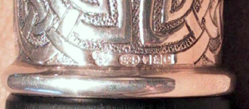 さて、そのような奇特な職人たる Henry さんにお願いした、もう一つの私のリクエスト、パイプと同様に Dirk Handle Design の中に彫り込んでもらったマイ・イニシャルは上のとおりです。パイプのベースドローンの写真(下)と見比べて分かるとおり、 Henry さん、今度は私のイニシャルを縦に彫り込んでくれました。どうやら、彼自身もバリエイションを楽しんでいるっていう感じがしますね。今回の縦のデザインの方がディテールの仕上がりや2つの文字のバランスが良く、パイプへの収まり具合も自然でとても気に入っています。 ![]() さて、ここでちょっとシルバーに話を戻して、スターリング・シルバーの品質保証の話。 英国内で製作された金、銀、プラチナなど貴金属製品には、その製品が確かな基準に基づいて製作された証や製作した工房名、製作年等を明らかにするため、法律に基づいて刻印(Hallmarks)を押す事が義務づけられているのはご存知でしょうか。そして、その法律は15世紀にまで遡るものなので、過去数百年間に製作さてたシルバー製品を見れば、その製品がいつどこで製作されたかが、すぐに判明するという仕組みになっています。つまり、例えば19世紀に製作されたヴィンテッジ・パイプでも、もしそのパイプにシルバーの装飾がされているとしたら、その製作年代が容易にかつ厳密に特定できるという訳です。