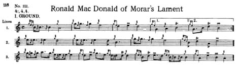 第22話(2004/10) Ronald MacDonald of Morar's Lament ■ Bob Dunsire.com Piobaireachd forum ■ 正確に数えたことはありませんが、優に300曲を超すピーブロックの中で一番多いと思われるのは多分ラメント (Lament)ですが、その中でパイパー森が勝手に「3大ラメント」と位置づけている曲があります。そして、その内の 2曲は言わずと知れた "Lament for Patrick Og MacCrimmon" と "Lament for the Children" だということは、これまで私の書いて来た文章を丹念に読まれ てきた方はすでにお気付きのことと思います。 …で、「最後の1曲は?」と問われれば、やはりそれは Patrick Og と比類すべき Iain Dall MacKay の名作 "Lament for Donald Dughal MacKay" というところでしょうか。でも、さらに選択肢を5本 の指まで広げれるとすれば、"Lament for Donald Laggan" と共に今回のタイトル曲 "Ronald MacDonald of Morar's Lament" リストアップしない 訳にいきません。 な〜んて事をたった一人で考えているパイパー森ですが、身近な場所にピーブロックについての印象を語り合う相手が殆 ど居ないので、実際にはこのような印象を共有することがなかなか出来ません。日頃からある曲、ある演奏に関する感動を誰 かと共有したいという想いを果たせないままに悶々としつつ、読み人の宛の無い印象記を徒然に書き連ねているのがこのサイ トなのです。 ところが、Bob Dunsire さんのところのピーブロック・フォーラムで は、ピーブロックをこよなく愛好する人たちが 様々な話題について侃々諤々やっていて、羨ましくて仕方ありません。あ〜、もっと英語が堪能だったなら、「そうそうそ う、そのとおり」ってな感じでじゃんじゃん書き込みするんだがな〜、と思いつつ…。(Bob Dunsire さんが2006年に亡くなった後は、サイトは閉鎖されましたが、各フォーラムは娘さんの尽力により継続され ています。極めて貴重な情報源でもある過去ログも全て残されています。) 実は、このフォーラムがこんなに盛り上がっているということを知ったのは、このフォーラムが出来て2年半程経った
