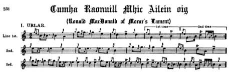 longer with us. ■ ピーブロックの楽譜はホントに不思議だ… ■ さ〜て、こんなやりとりを読むと、 gatormac さ んのいうとおり、俄然この名曲に取り組もうとする意欲が沸き上がります。 この曲は、"Lament for the Children" や "The Old Woman's Lullaby" な どと同じく、Urlar〜Ver.1〜Ver.2 と進行するに従ってウルラールをほ〜んの僅かづつ変化させていく形式の、《真に味わい深いウルラールのメロディーを持つ曲》だけにみられる「ウルラールの美味しさを3回味わう」タイプの 曲です。 …なので、この曲に取り組もうとした際に頭をよぎったのは、「ウルラールを覚えてしまえば、後は簡単。特に Taorluath と Crunluath のメロディーの流れは自然と出てくるし…。」ということでした。 ところが、実際に取り組んでみると何故か? 捉えにくい…。 はてさて、どうしてこんなに覚えにくいのか? と首を傾げるばかりでした。 何度も繰り返しますが、音楽的素養が殆ど無い私は正確な意味で「楽譜 を読んでいる」訳ではなく、その行為は「耳で聴いたま まの音の並びを楽譜をたよりにしながら再現している」ってところなので、その不思議の原因に気が付く までに大分時間が掛かりました。 実は最初はいつものとおり、Kilberry の赤本の楽譜を使っていましたが、ある時ふと、Piobaireachd Society Book をひも解いてみたところ、その違和感の原因がやっと判明したのです。 これは、Kilberry Book のウルラールの部分 そして、下が Piobaireachd Society Book の同じ部分です。 まず、一見して異なるのは、Kilberry の方