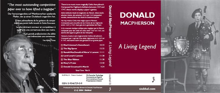 がっているという訳ではないということです。 パイパー森はプラクティス・チャンターでハイランド・パイプの練習を始め、そしてピーブロックの音源をコレ クションし始めた1970年代半ばに、この Donald MacPherson の "Pibroch Masterpieces" というそのものズバリのアルバム (1976/Polydor)を 入手しました。当然ですが、アナログレコードのこのアルバムは両面に2曲づつ、計4曲のピーブロックだけで構成 されていました。その4曲というのが "The Old Woman's Lullaby" "The Lament for Patrick Og MacCrimmon" "Salute on the Birth of Rory Mor MacLeod" "MacKintosh's Lament" という正真正銘の傑作揃 いとく れば、正にタイトルに偽り無しといったところ。これ以上何をか言わんや、です。同じ頃に入手した同様の構成 (ピーブロック4曲入り)の Seumas MacNeillによる "Purely PIOBAIREACHD" という アルバ ムと並んで、パイパー森をいたく満足させてくれた思い出深いアルバムです。 さて、2004年夏、この Donald MacPherson の最新の演奏をフューチャーした新しいピーブロック・アルバムがリ リースされました。録音時(2003年)に彼は実に81才を迎えていたはず。直系の繋がりはなくても、やはり高 齢でもお盛んな MacPherson Piper の 血統はちゃんと受け継いでいるようです。 このアルバムは単なる1枚の CD というのではなく、実に、168ページにおよぶ CD ジャケットサイズのハードカバー・ブックレットが付いています。「ブックレットが付いている CD」というよりも「CD が付いたブックレット」という方が当たっているかな、とも感じられる程に立派な CD & Book という形式でリリースされました。 > プロデュースしたのは、あの Barnaby Brown。数年前に Pibroch.net を立ち上げた彼が、同じく自身で立ち上げていた Clarsach.net と Triplepipe.net と を併せて連携させ、アイルランドとスコットランド等のゲール文化圏における伝統的音楽に関する情報の共有化・教 育・支援運動を推進することを目指して設立した Siubhal [shoo-al] という組織の最初の有形な成果としてリリースされたのがこのアルバムなのです。 収録されている曲は "MacCrimmon's Sweetheart" "The Big Spree" "Ronald MacDonald of Morar's Lament”“Lord Lovat's Lament" "The Blue Ribbon" "Mary's Praise”“Donald Gruamach's March" の 7曲。内容は上のこの CDブックのジャケット写真にリンクしている Siubhal のサイトのページで詳しく紹介されてい ますのでそちらを参照してください。 PDFファイルをダウンロードして、このジャケット写真を拡大して見る事もできます。 ブックレットの中身は、非常に分かりやすい英語を書いてくれる Bridget MacKenzie が収録曲の詳しい 説明を書き下ろした "History and folklore surrounding this music"、Barnaby Brown による "Making sense of pibroch"、Donald MacPherson 自身による "How I was taught to play”、James Campbell & David Murray が Donald MacPherson の 演奏に関して 過去の新聞や雑誌等に掲載された多くの賞賛記事を紹介した "A flood of melody" という4つ の記事です。実質的にはこれらは、併せても40 ページ程度の量なのですが、なんとご丁寧に英語で 書かれたそれらの文章を、ドイツ語、スペイン語、フランス語の 各言語に翻訳して、つまり4か国語にして納めてあるので、最終的に168ページという厚さになっているのです。 ところで、この CD ジャケットサイズの手の込んだハードカバー・ブックレットの製作が相当クセものだったらしく、実は当初この CD & Book のリリースがSiubhalの サイトでアナウンスされたのは、2003年末のこと。パイパー森はすかさず注文を出した(Order No.32 でした)のですが、直後にリリースの延期が通知された後、2004年3月、6月、とリリースの予定がアナウンスされましたが、その度、印刷&製本のトラブ ル等の理由で実際のリリースは再三延期されました。そして、8月になってやっとのことで本当にリリースされたの でした。 ■ 究極の演奏が最高の音質&録音状態で… ■ Donald MacPherson は半世紀を超