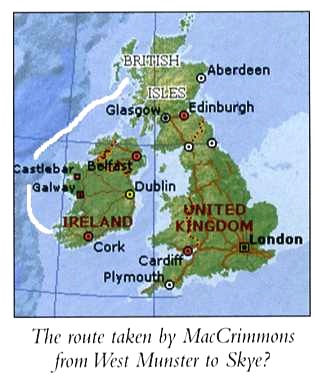 いう名前がある。 その証書の写本の中には、McCrumon、McRemon、McRedmond といった名前が繰り返し出て来ている。そして、こられは皆、McRedmond(ア イリッシュ綴りでは MacReamoinn となる)のバリエイションになる。 また、Galway 州の Clare の Barlny という場所の土地の譲渡証書にも McCremon と MacRemon という名前が出て来くる。 投稿者は、これらの証拠が直ちにスカイ島の MacCrimmon 一族との関連性を証