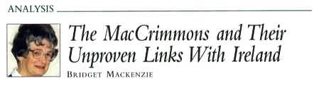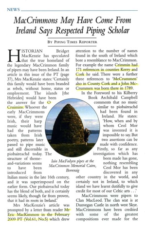 あるいは McCremon であったという可能性は高いのではないか? さ〜て、この投稿があった僅か3ヶ月後の "Piping Times" 2009年5月号に、かの Bridget MacKenzie 女史が Analysis のコーナーでこの投稿に呼応して次のような分析レポートを発表しました。タイトルは… "The MacCrimmon and Their Unproven Links With Ireland" MacKenzie 女史、Eric McKimmon 氏の投稿を読んで次の2つの明らかな史実が頭に浮かんだそうな。 一つ目は、スコットランドに於ける MacCrimmon