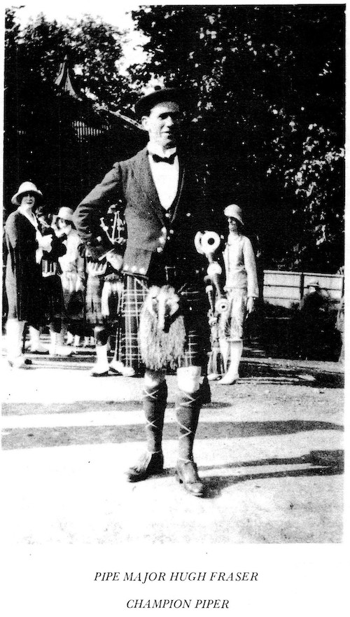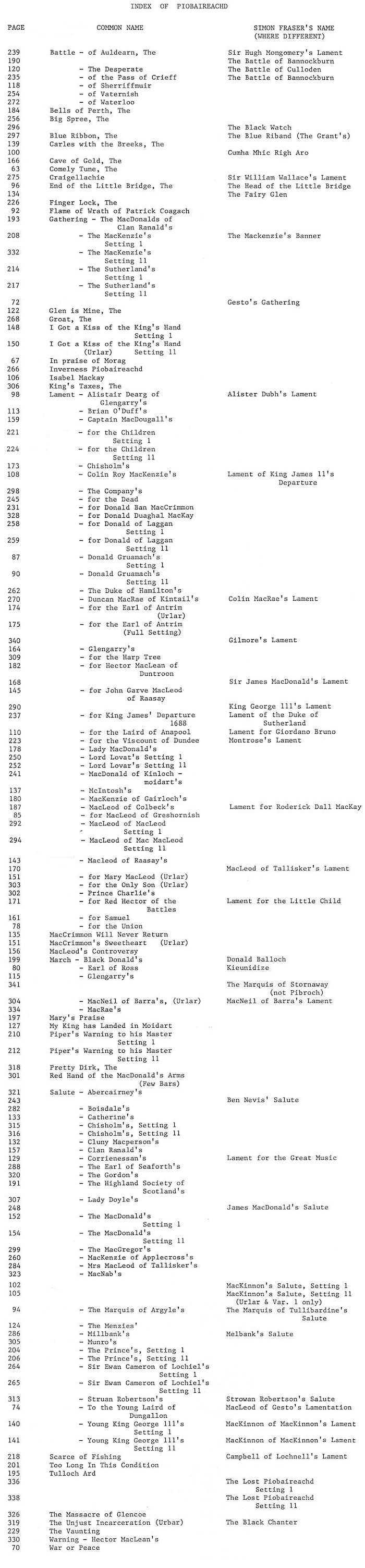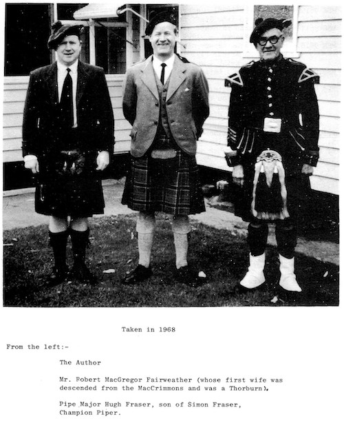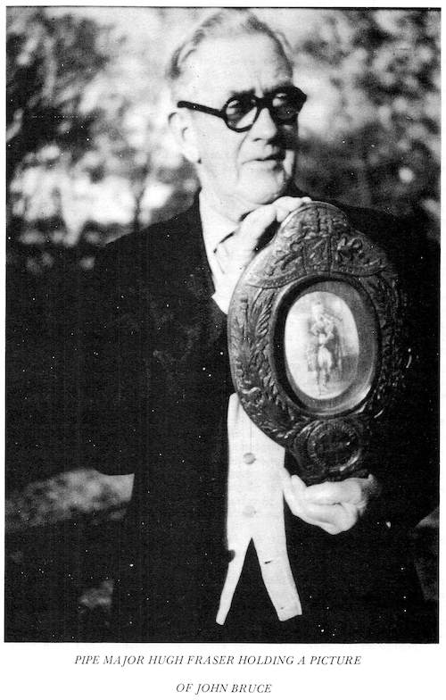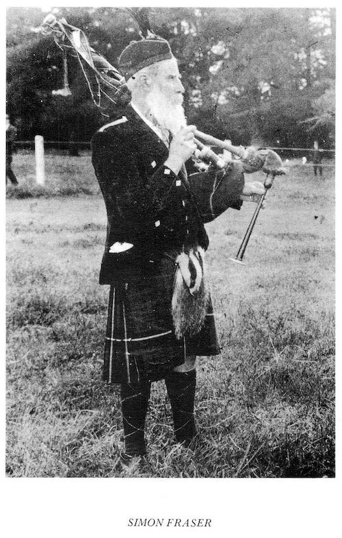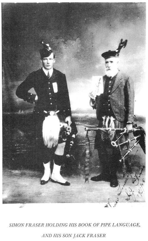 は、さまざまな入手先から得た物です。筆者は Simon の次男であるHugh Fraser からピーブロックを手ほどき受ける中で、約80曲について主に楽譜を通して学びました。Hugh が1970年に亡くなった後、彼の息子の Hector は、主にカンタラックで記された約60曲のマニュスクリプトをコピーすることを許可してくれました。 1976年に P/M William Gray が亡くなった際には、未亡人は、楽譜やカンタラックで記された約90曲のコレクションを筆者に売り渡してくれました。幾つかの曲に署名入りのコメントが記 入されていた事から、このコレクションは、以前に Dr. G. S. Ross が所有していたものである事は明らかです。コレクションの一部は、恐らく Dr. Ross 自身によって書き下ろされていますが、曲の構成は Simon が使用したのと同じ形式に従っています。Gray コレクションの残りは Simon Fraser 自身の手になるものです。 A.K. Cameron と Dr. Ross-Watt からのさらなるコレクションとして、Gesto 本の20曲(1828年)の楽譜と、その他の20曲の楽譜が エジンバラのスコットランド国立図書館に寄託されています。 約20年に渡って偶然の産物として収集されたこれらのコレクションについて、すべての資料の日付を特定することはできませんで したが、Simon の作品の特徴について特定できる均一性を示 しています。 Hugh Fraserは、オーストラリアのチャンピオンパイ パーであり、1895年から1930年にかけてオーストラリアのソロコンペティションサーキットに出場しました。Hugh は、チャンピオンの地位を維持するために、父親のプレイスタイ ルをいくつかの点で変更する必要がありました。彼は、Leumluath、Taorluath、Crunluath のミドルA(redundant A)を押しつぶさなければならず、’heiririn’は、最初と最後の音を強調する様にビートを変更せざると得ませんでした。しかし、Simon の表現の多くの特徴は保たれています。 Hugh Fraser は非常にセンシティブな性格の人物で、パイピング・テクニックについて論争する事を好みませんでした。論争好きなパイパーの多くはその当時一般的だった奏 法にこり固まっていたので、その様な人々に対して(フレイザー・スタイルの)パ イピング を伝授する事は出来ませんでした。Hugh は(フレイザー・スタイルの)ピーブロックを非常に個人的なものと見なし、それを演奏する ことに よって、自身で深い感動を得ていたのです。 著者は、彼に多くの時間と原稿の資料を与えてくれたオーストラリアのビクトリア州出身の故 Miss Blanche Jebb、Mr. Hector Fraser、Mr. Harry Fraser(Simon Fraser の 父親 Hugh Fraser の子孫たち)に謝意を表しま す。エディンバラ大学の School of Scottish Studies の Mr. Peter Cooke による、この本を作成する上での全てのアドバイスに対して心から感謝いたします。 ※ 謝意を表したこの一文の中に、Geroge Moss を見 出したエジンバラ大学 School of Scottish Studies の Peter Cooke の名が登場している事に注目。 ●The History of the Frasers P11