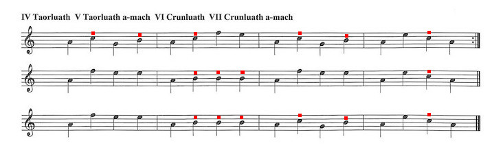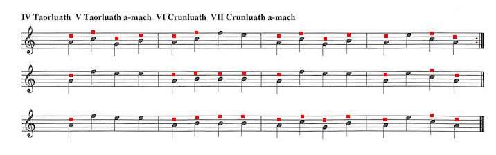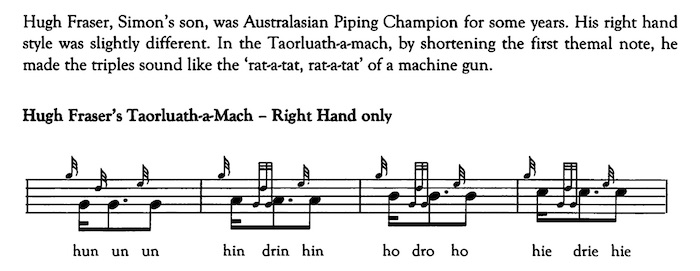 について触れてみたいと思います。(フレイザー・スタイルの楽譜/クリックで拡大⇒)比較するのモダーンスタイルの音源は The World's Greatest Piper シリーズ Vol.4 Murray Henderson の演奏音源です。同じ音源がピーブロック・ソサエティーのサウンド・ライブラリーにも収録されています。 PS サイトの説明にもある通り、この曲のそもそもの伝承元は Simon Fraser です。なので、スコアについても、表記の違い こそあれ構成はほぼ同一。そして、演奏についも、2人は Urlar、Var.1、Var.1doubling については Orme の方が若干アップテンポである程度の違いで、さほどの相違感はありません。また、Taorluath と Clunluath については、それが「トラディショナルタイプ か否か」の違いですが、余程注意して聴かない限り、これもさしたる相違感は感じられません。 しかし、ショッキングな程に違うのは Taorluath-a-mach と Crunluath-a-mach のバリエイション。↓は The Blue Book の解説ですが、書いてある通り何と フレイ ザー・スタイルでは a-mach は右手の指全て(この曲では D を除く lowG、A、B、C)で演奏 されるので す。ご存知の通り、モダーンスタイルの常識では a-mach は B、C、D だ け(この曲で は D は無し)です。 さらに、フレイザー・スタイルでは2つ目の音を伸ばすスタイルなので(MacArthur-MacGregor のスタイル)、装飾音自体のリズム感が大きく異なります。Dr. Barrie Orme は説明の中で「Hugh Fraser は Taorluath を3拍子(triple sound)でマシーンガンの様な "rat-a-tat, rat-a-tat" という風に表現した。」と書いています。 ![]() ![]() ↓ Cave of Gold のフレームに、それぞれスタイルで a-mach を演奏する音に赤点をつけました。見ての通り、Fraser スタイルでは殆どの音が a-mach で演奏される事になります。a-mach 自体のリズムの違いと相まって、全体のリズム感の違いは衝撃的です。 モダーン・スタイル