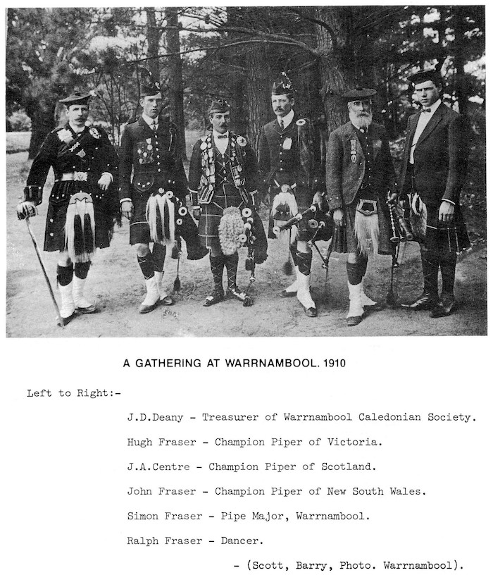 の息子 Norman の手元に有った物は Norman が1847年に亡くなったときに失われたました。Simon は校正刷りを取り戻すために Benalla に戻りましたが、既に子供たちが破って捨ててしまった言われました。こうして、1826年に作成された Gesto の2つの校正刷りは永遠に失われてしまったのです。 1914年、Simon を更なる甚大な不幸が襲います。長男 John が(妻と4人の子供を残して)死去したのです。Simon からマクリモンの伝統を丁寧に教え込まれていた John はチャンピオンパイパーの地位を確保していました。 Simon Fraser はその後1920〜30年(76〜86才)には、東メルボルンに居住。この間、彼はパイプ音楽のマニュスクリプトについて最も活発に執筆を行なっていまし た。それらの多くはアメリカの A.K. Cameron、カル カッタの Dr. G.F. Ross、南アフリカの J.D. Ross-Watt といった海外の文通相手に送られていました。スコットランドの P/M William Gray は G.F. Ross との文通によって Fraser の手になる約90曲を収集しました。 Simon は他の2人の息子、Hugh と Ralph に、鞭編み、バイオリン、バグパイプを注意深く教え込みました。彼は彼らにマクリモンの歴史、秘訣とカンタラックを教え、彼らは また Peter Bruce からもバグパイプの教えを受けま した。 1907年、スコットランドでパイプ