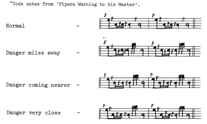 ここでは Simon Fraser の伝えるピーブロックが「3」という数字で構成されている事を強調しています。1小節の中が3つの主要音で構成される事、バリエイションが3行で構成され る事などです。 この内容は極めて特異で興味深い内容です。APCのサイトや "APC Guide to Pibroch" も含めて他では目にした事が有りません。簡潔にまとめられているので、抄訳と共に譜面を引用し ます。 出典は Simon Fraser の1912年8月20日付けの記述。 「伝統的に、古のハイランドでは完璧な信号システムを持っていました。危険が迫った際、夜間に主要な丘でかがり火を焚き、人々 に危険を警告しました。」 映画「指輪物語」には、正にこの文章で描かれている様にして、丘の頂から頂にかがり火がリレー的に焚かれて、遠隔地に素早く情 報を伝達するシーンが出てきます。北米の先住民族などの「狼煙を上げて」情報を伝達するのと同じです。 「バグパイプも警告伝達楽器として使用されていました。パイパーたちの間では、Warning Tunes で使用するための次の様な完璧なコードシステムがありました。Warning Tune の最後の2小節の音は同じであることがわかります。この配置を基に、パイパーはこれらの小節の音を変更し、代わりに暗号となる音列を挿入。秘密の暗号音列 によって危険を警告して仲間の命を救ったのです。 暗号音列を耳にした全てのパイパーが、自分のパイプを手にして、それらを演奏。 人々は襲撃が近づいている事を知るのです。そのシグナルに従って、戦士は敵と戦うために集まり、女性は子供を集めて事前に決めら れた避難所に逃げ込む、老人や少年は襲撃が終わるまで武器や食料の貯蔵庫の守りを固めるのです。」 ![]() The Red Book の本文紹介は以上です。 ■ The Barrie Orme