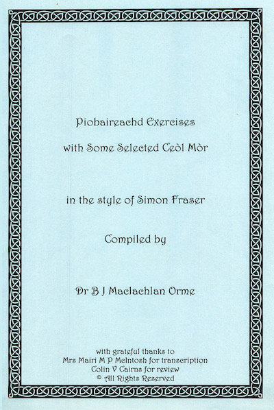 から教えられた演奏を録音したものです。Hugh の父 Simon Fraser はいくつかのソースからセッティングを引き継ぎました。それは、両親がカンタラックで歌った調べ、マクリモン一族の直弟子であった Glenelg の Alexander Bruce の息子である Peter Bruce の教え、そしてそれら と共にスカイ島の Neil MacLeod of Gesto によるカンタラックのマニュスクリプトです。このマニュスクリプトは Iain Dubh MacCrimmon のカンタラックから書き起こされ、1828年に Simon の父 Hugh Archibald Fraser によってオーストラリアに持ち込まれたました。 Simon Fraser は 口承またはマニュスクリプトから習得した曲を、音譜と文字との両方に書き起こしました。彼は「ピーブロックについて殆ど理解していない、まるで才能の無い 演奏者である。」と言われて来ましたが、それは有り得ない事です。ピーブロックを完璧に理解していない人間が、あれ程に音楽的か つ私たちが知っているピーブロックの構造と伝統に完全に一致する一流のセッティングを作り出すことができるはずがありません。彼 がパイピングを真剣に考え始めたときに40歳を過ぎていたという意味から、彼は無頓着な演奏者だったかもしれません。ですが、彼 は確かにこの音楽を理解していました。 Barrie Orme は自身に「Simon Fraser のセッティングを公に知らしめ、師匠の演奏スタイルを記録し保存する。」という任務を課しました。そして、数冊の本を出版するだけでなく、3時間の演習ビ デオを制作。今日では使われなくなった、オールドスタイルで使用されている様々な運指をどのように演奏するか、そしてこれらが 各々の曲でどのように使用されているかを実演しています。その後、彼はこのビデオからDVDを作成しました。曲の演奏ではなく、 運指の演習です。彼はまた、Hugh Fraser から学んだ曲から6枚のCDを作成しました。その中からセレクトしてこれらのCDが制作されました。 彼が1979年に出版した最初の本である