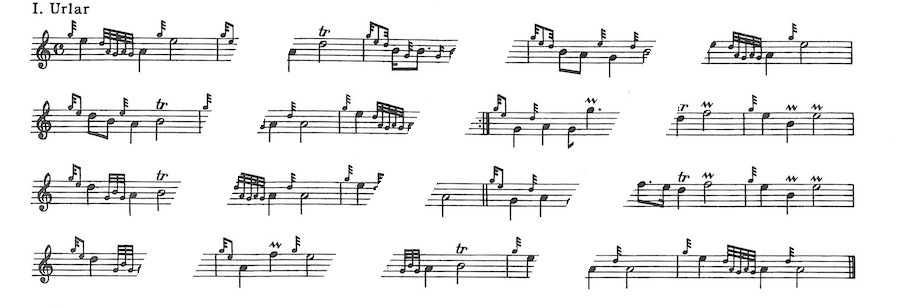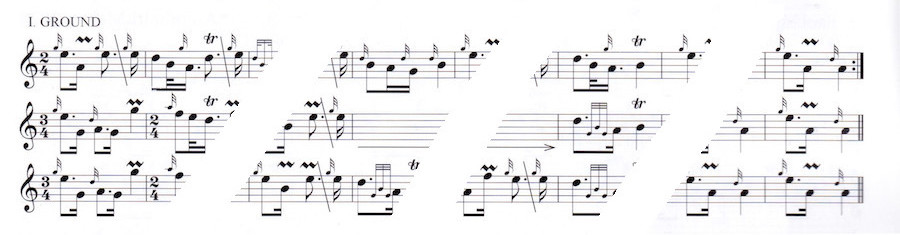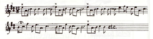 楽譜は極めて見難い。何故か譜面は4列で表記されていて、1列目と4列目が5小節、2列目と3列目が6小節という振り分けになって、そこに