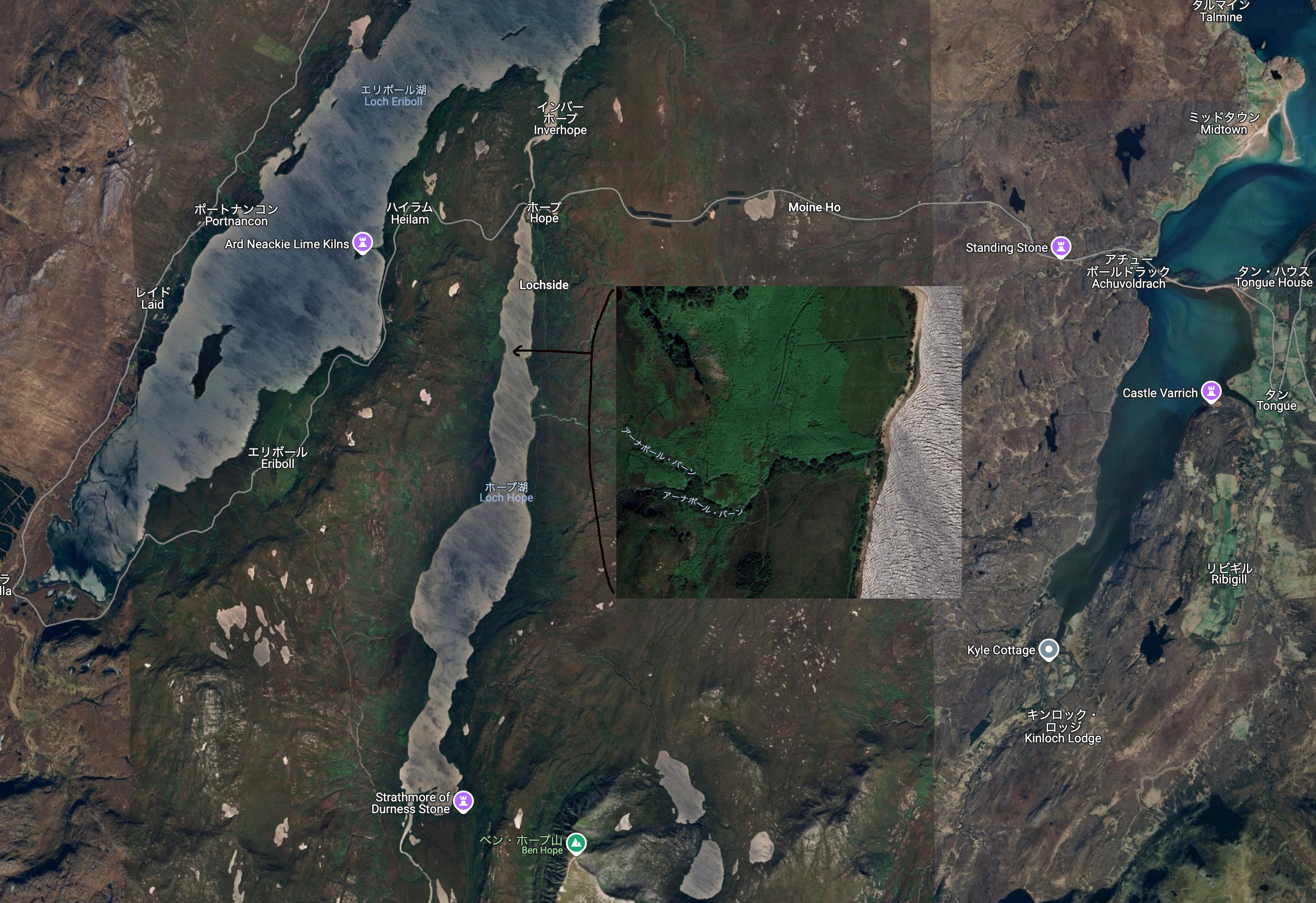 橋の西側、Loch Hope の北端、Tongue と Durness