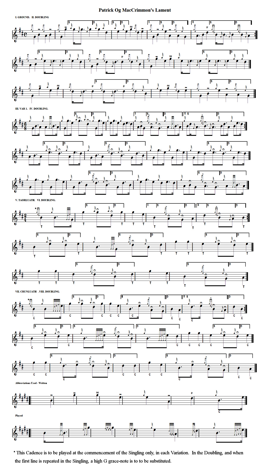 にお抱えのパイパーを送り込み、立派なパイパーに育ててもらうのを常としていました。 さて、肝心のこの素晴らしいラメント自体の誕生にまつわる 興味深いエピソードは次のとおりです。 あ るとき、「Patrick Og が死亡した」という悲報を聞いた Iain Dall は悲しみの中、悲哀に満ちたこの名曲を作りました。しかし、後日、実はこの悲しい知らせは真実ではなかったとい うことがわかりました。そこで、Iain Dall は Boreraig の Parick Og のところへ行き、師匠を前にしてこの曲を演奏したのです。そして、Iain Dall のこの素晴らしい曲を聴いた Parick Og は「生きている間に自分のラメントを演奏できるパイパーは、そんなにいないだろう。」と言って、この曲を大層気 に入り、以後は自分のお気に入りの曲として たびたび演奏したということなのです。