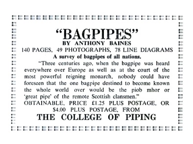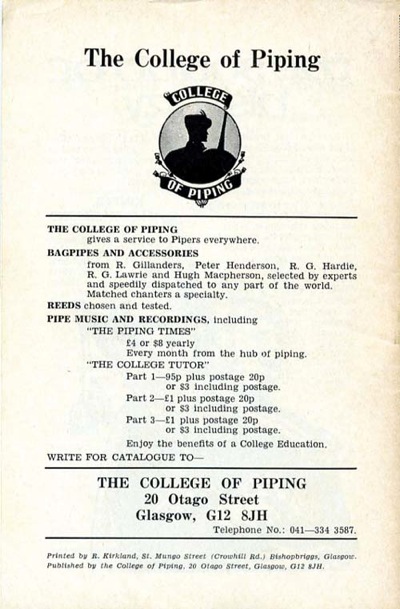 というコーナーはどうやら不定期に連載されているようで、この号では5ページに渡って、L〜Mの頭文字のパイパー18人が紹介されています。 今回の号では余り紹介することが無いので、CoP 自身の宣伝が掲載されている裏表紙をスキャンしました。 それによると。当時の“Piping